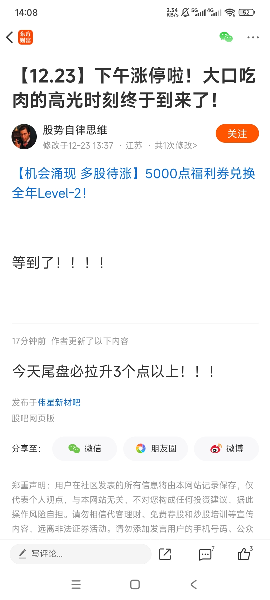 温馨提示: 1.根据《证券法》规定,禁止编造、传播虚假信息或者误导性信息,扰乱证券市场;2.用户在本社区发表的所有资料、言论等仅代表个人观点,与本网站立场无关,不对您构成任何投资建议。用户应基于自己的独立判断,自行决定证券投资并承担相应风险。《东方财富社区管理规定》