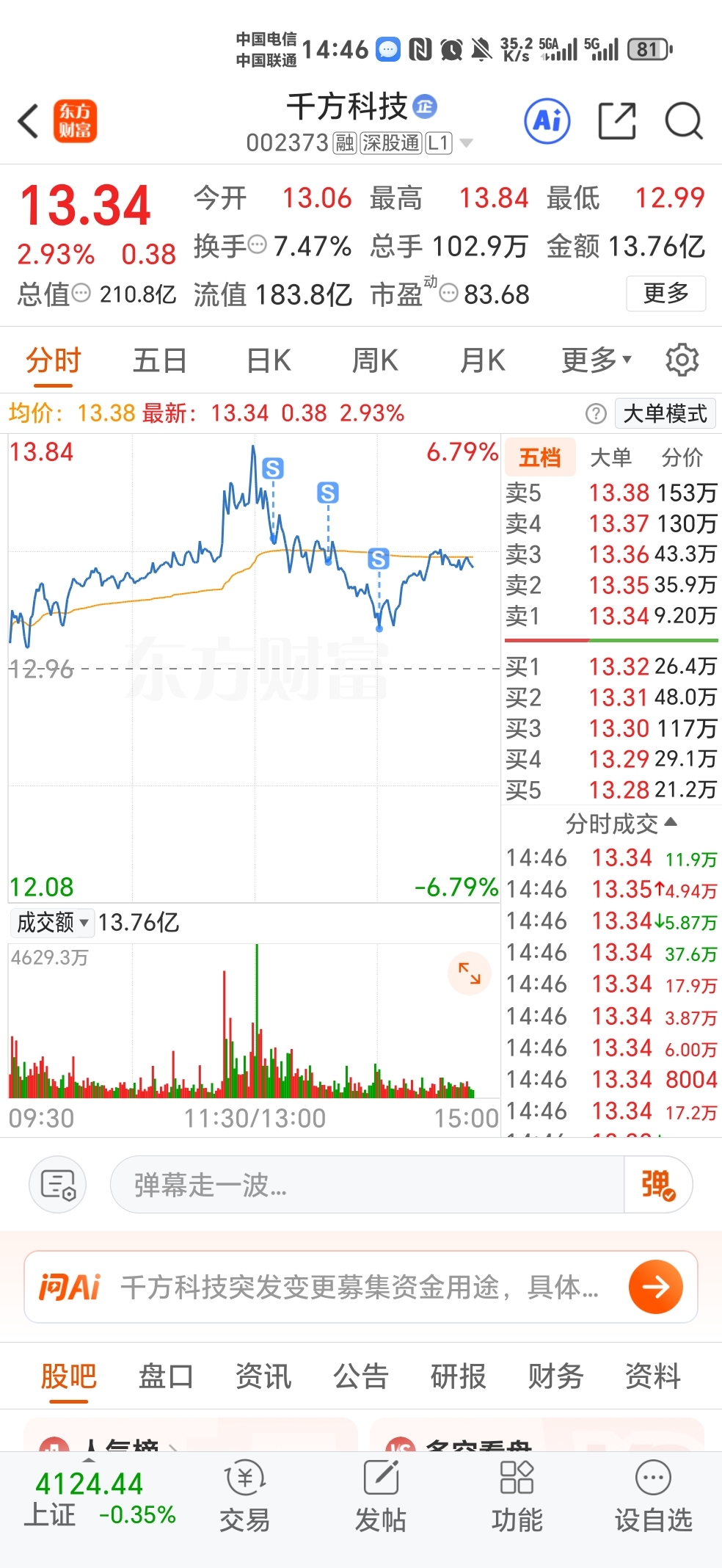$千方科技(SZ002373)$ 一万6千股被洗完了