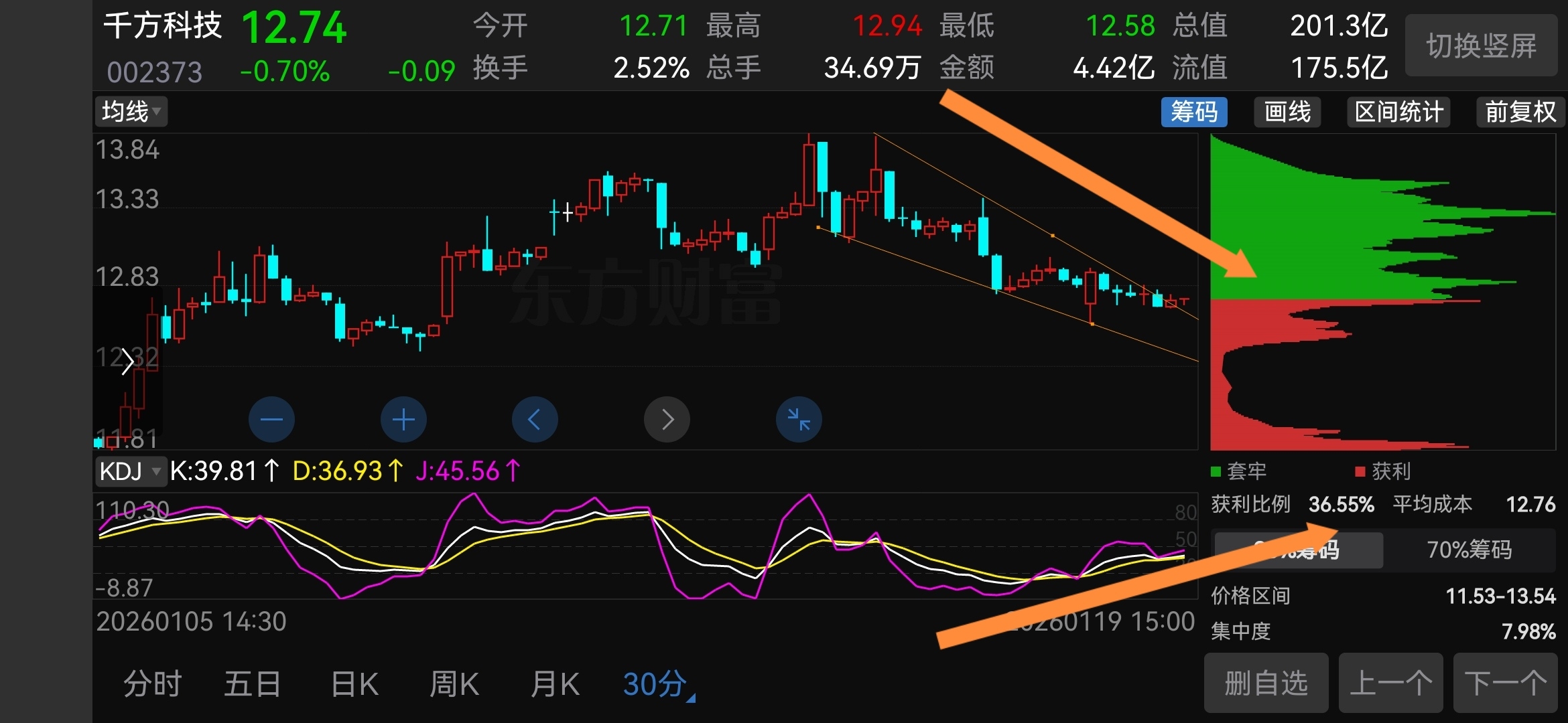 30分钟KD㡳背离,走出了一个下倾楔形,这种形态,一态突破上轨,会快速回到起跌点,起跌点是哪里,13.86。日线形态已经是对12.5前高的突破回踩完成,分时也已经出现底背离信号,明天应该有戏看,