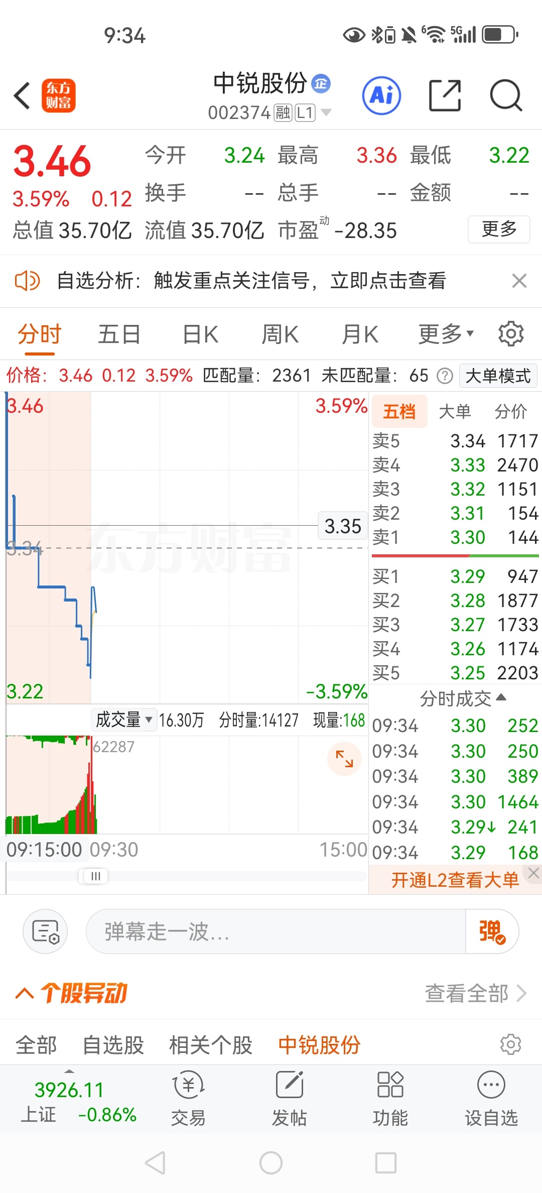 $中锐股份(SZ002374)$ 3.46没走,坐等拉升。