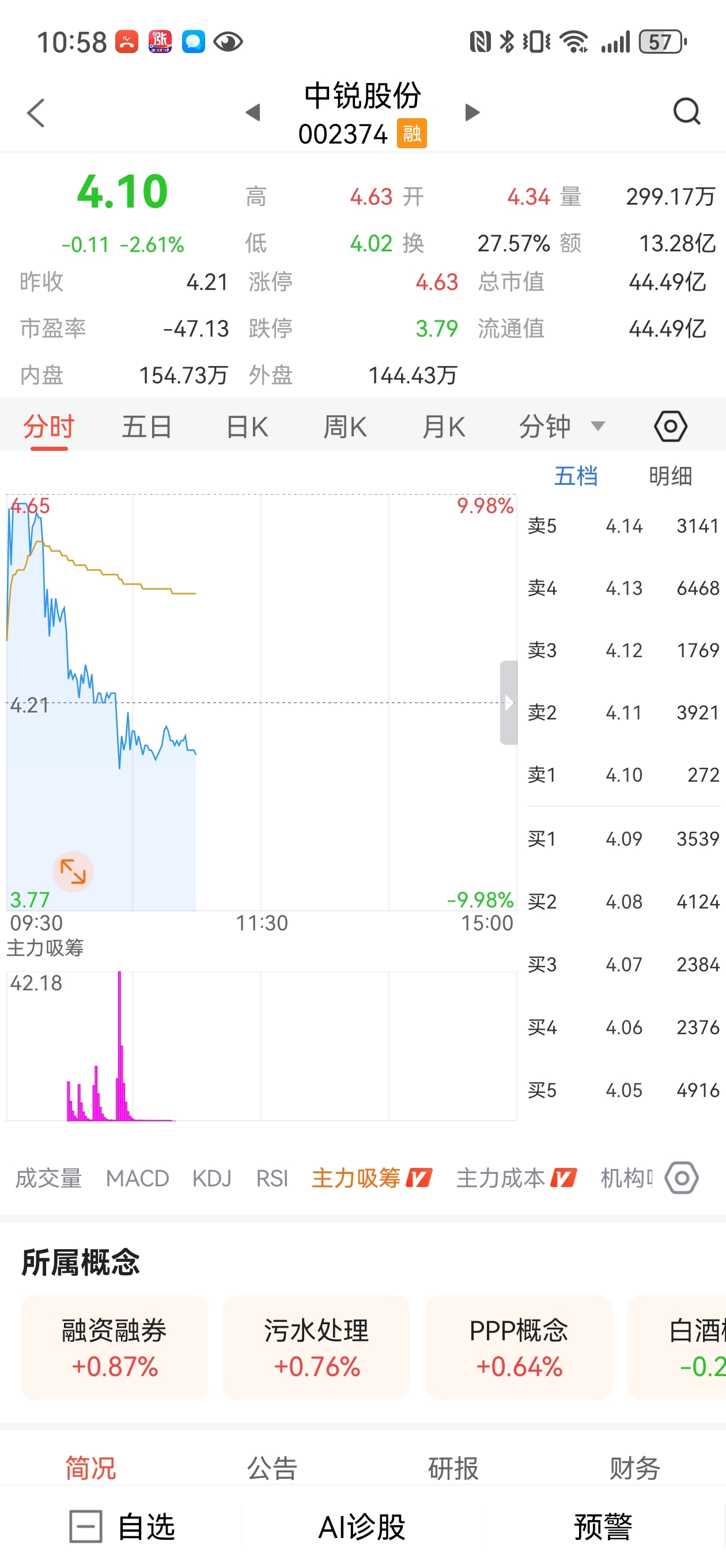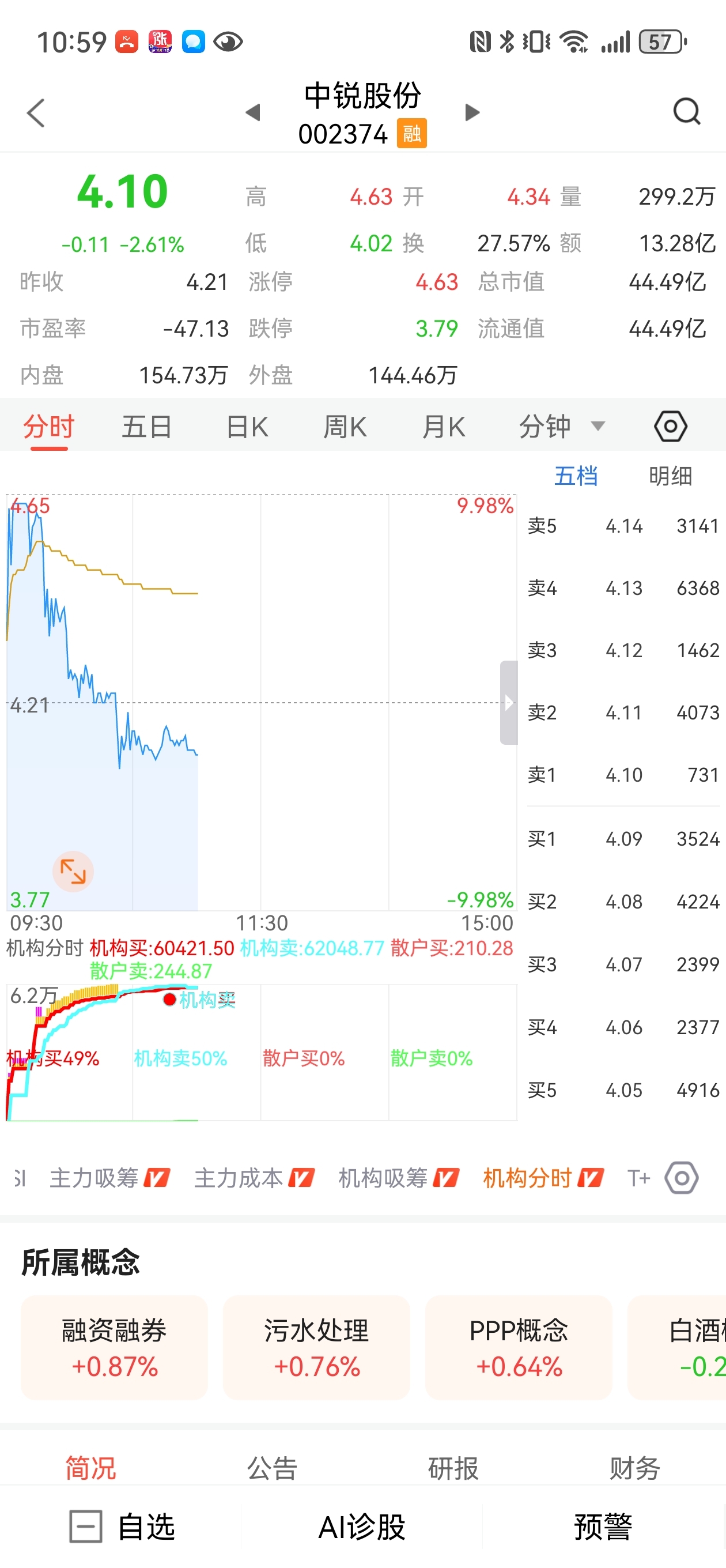 $中锐股份(SZ002374)$ 是洗盘还是出货?从目前的盘口资金看,是洗盘。机构买占比49%,卖50%。力量基本均衡。