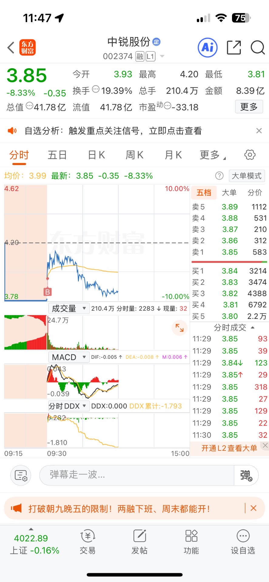 $中锐股份(SZ002374)$ 从早盘来看开盘有部分资金承接但无奈上方有部分抛压午盘有望冲高走强