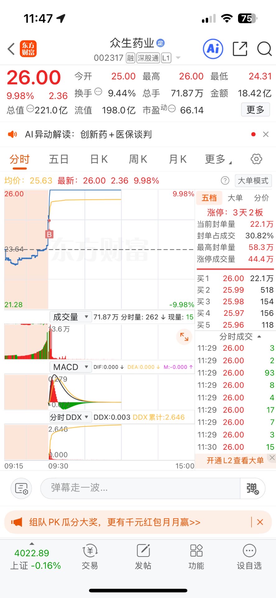 $众生药业(SZ002317)$ 早盘从集合竞价来看是超预期滴如此强势没有理由不上车也是博弈成功!