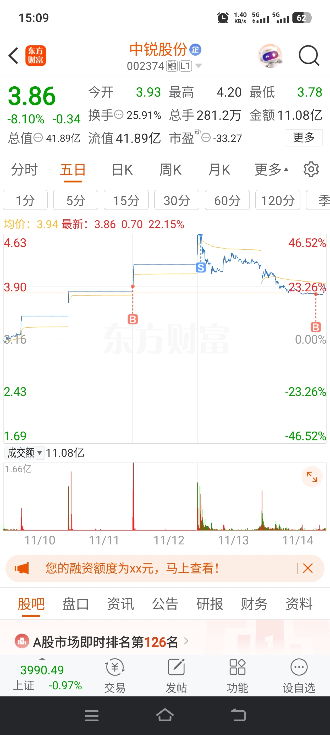 $中锐股份(SZ002374)$ 快进快出 亏了认 有盈利就跑