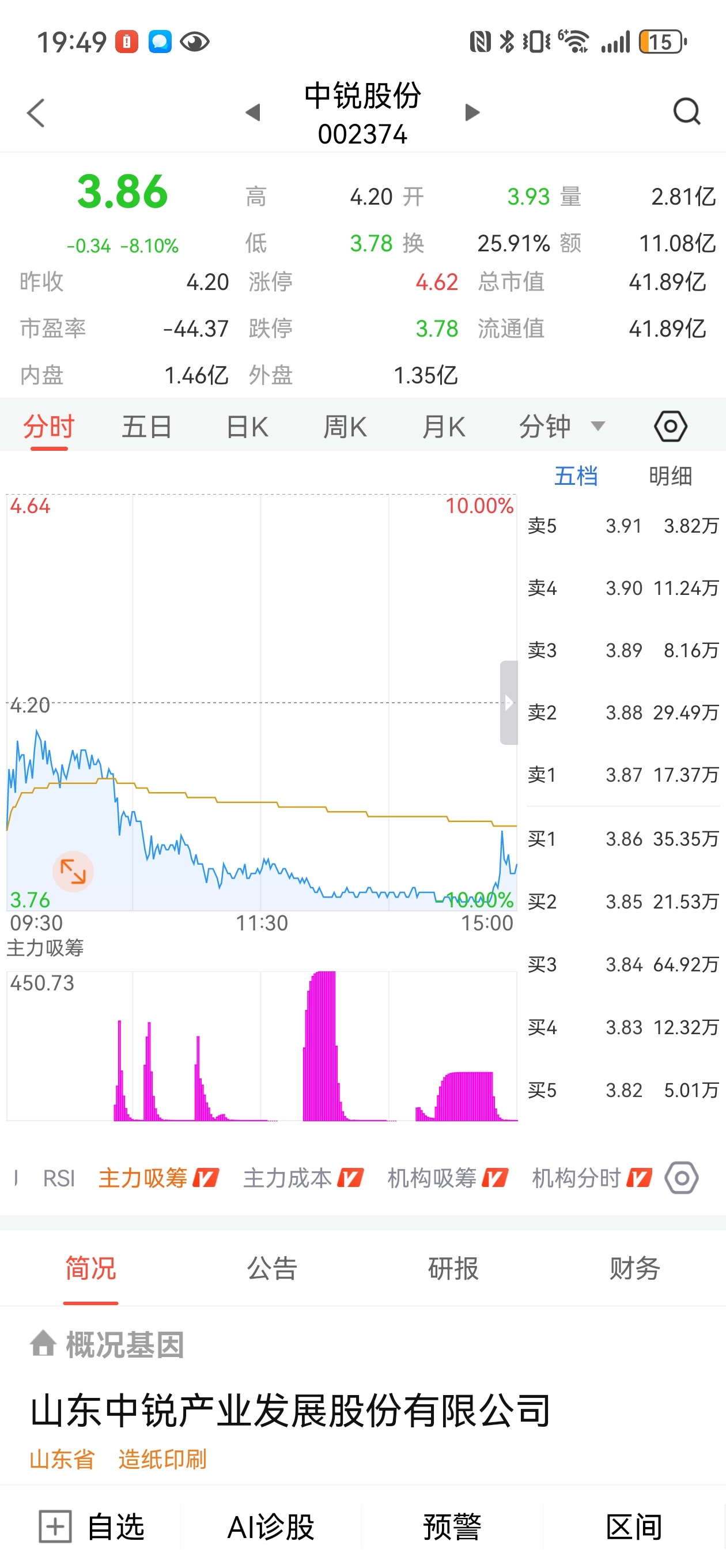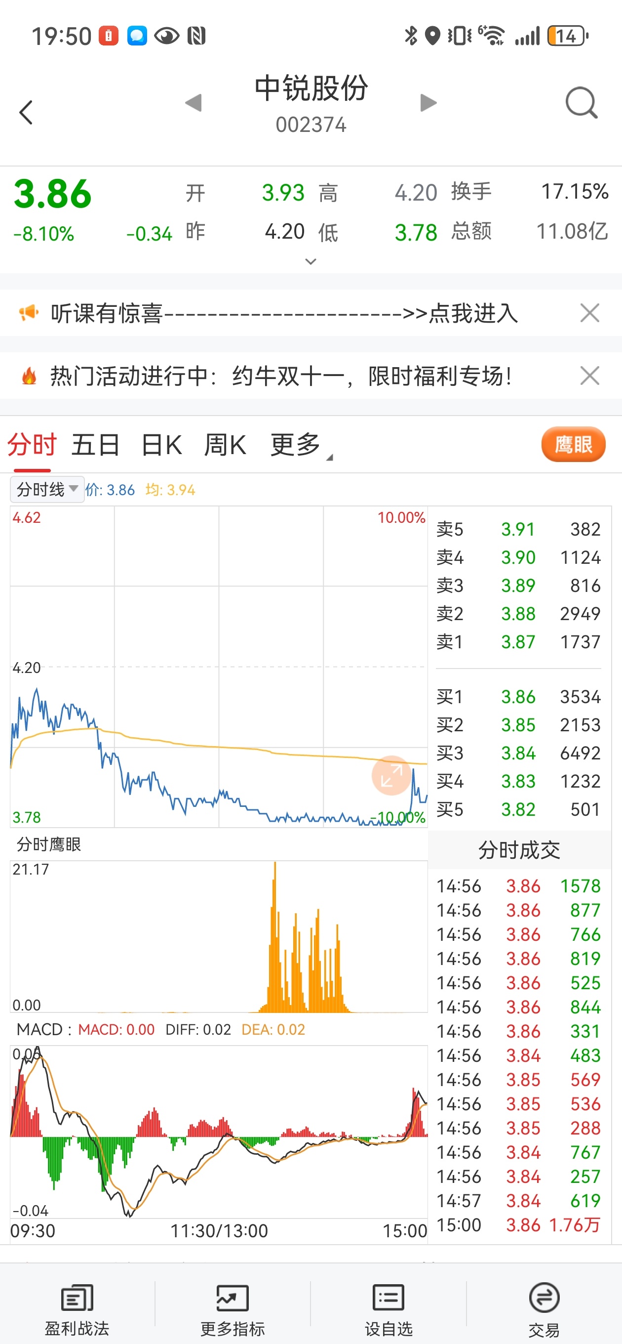 $中锐股份(SZ002374)$ 洗盘结束,周一高开后震荡涨停!从盘面看,下午空头势衰,勉强砸到跌停封不住。最后二十分钟更是只用300万股大单逆势拉升了4个百分点!周一也许低开下杀至十日线后涨停,也可能直接高开高走涨停!