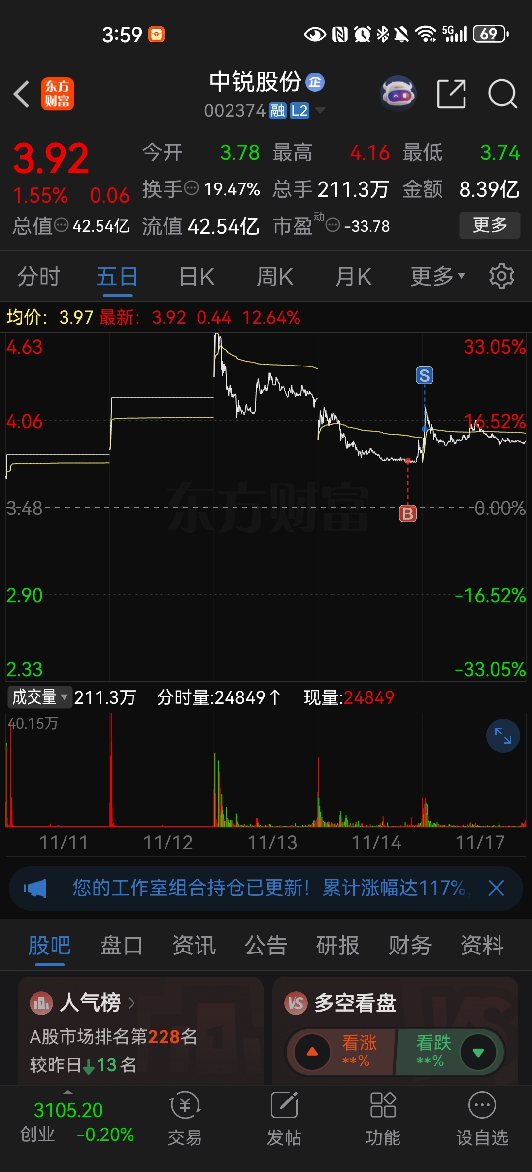 $中锐股份(SZ002374)$ 早上卖早了点