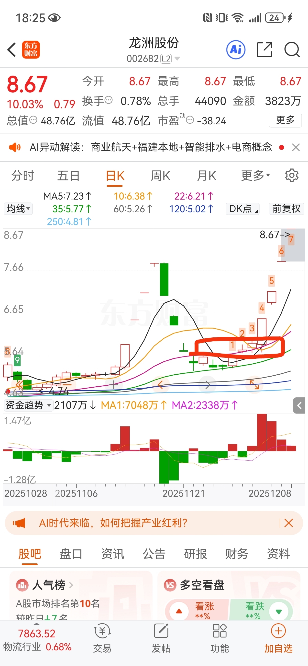 $中锐股份(SZ002374)$ 找到先前我说的跳空到20日线后三天不补缺口的股了,龙洲股份,该股四个涨停板后连续回落,杀到30日线企稳,横盘五天,后跳空到20日线,第二天继续高开高走!第三天低开下杀不破缺口后反转涨停!中锐前面跟他的走势很像,看看明后天吧,会不会有相同的奇迹?!