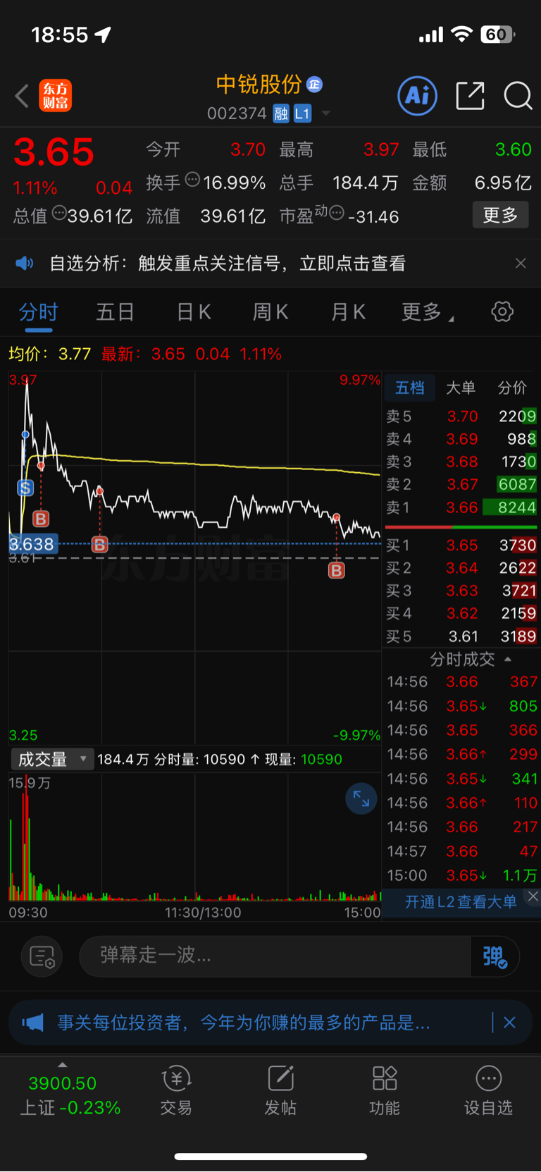 $中锐股份(SZ002374)$ 3.96一直盯着就是忍不下心卖掉