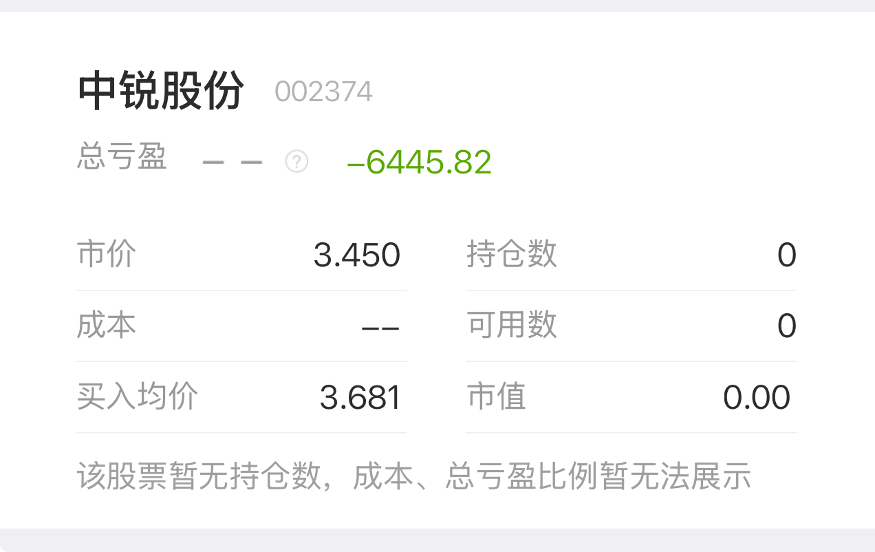 $中锐股份(SZ002374)$ 昨晚没睡好,因为昨天上头了,一直补仓,今天少亏点跑了,主力佩服你,也感谢你!再见!