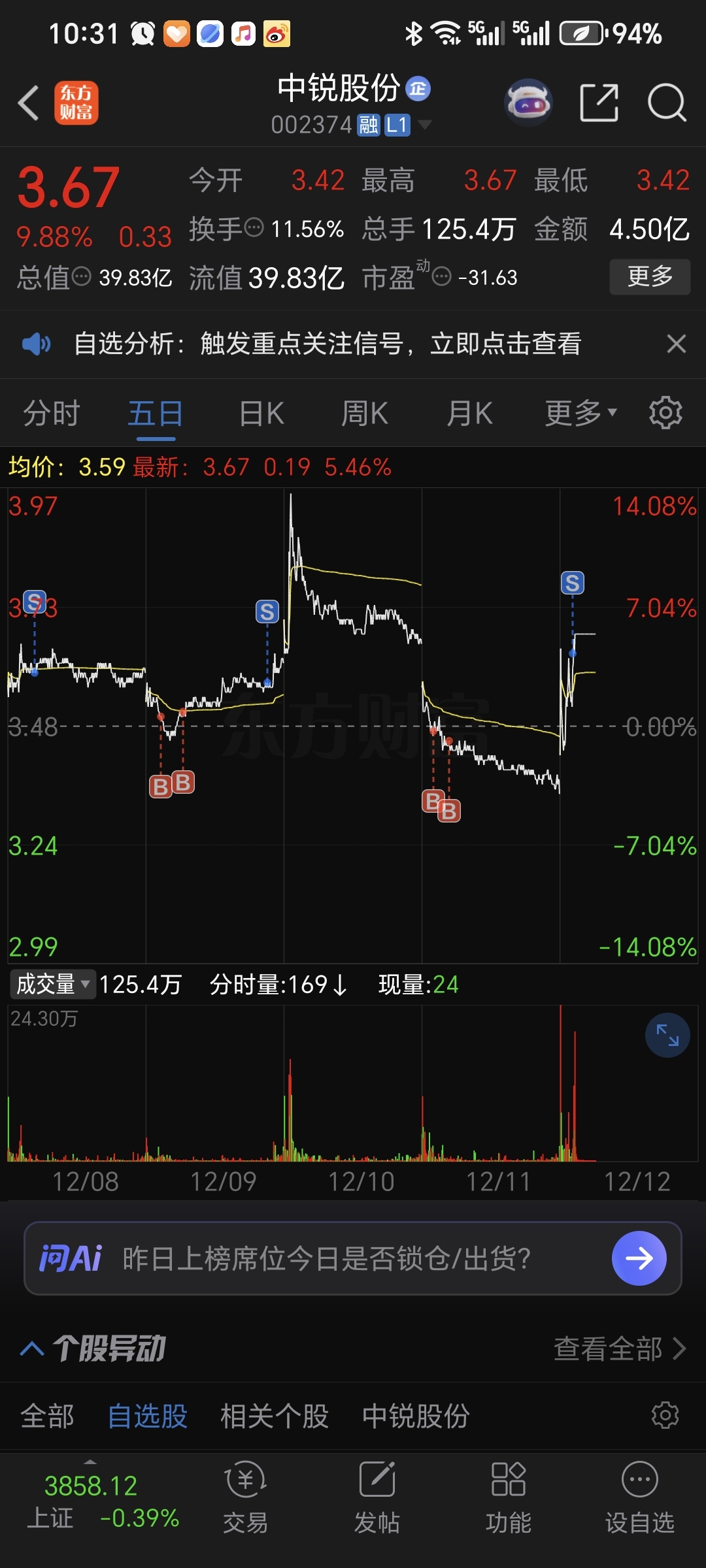 $中锐股份(SZ002374)$ 来回坐T!多做几次就赚钱了