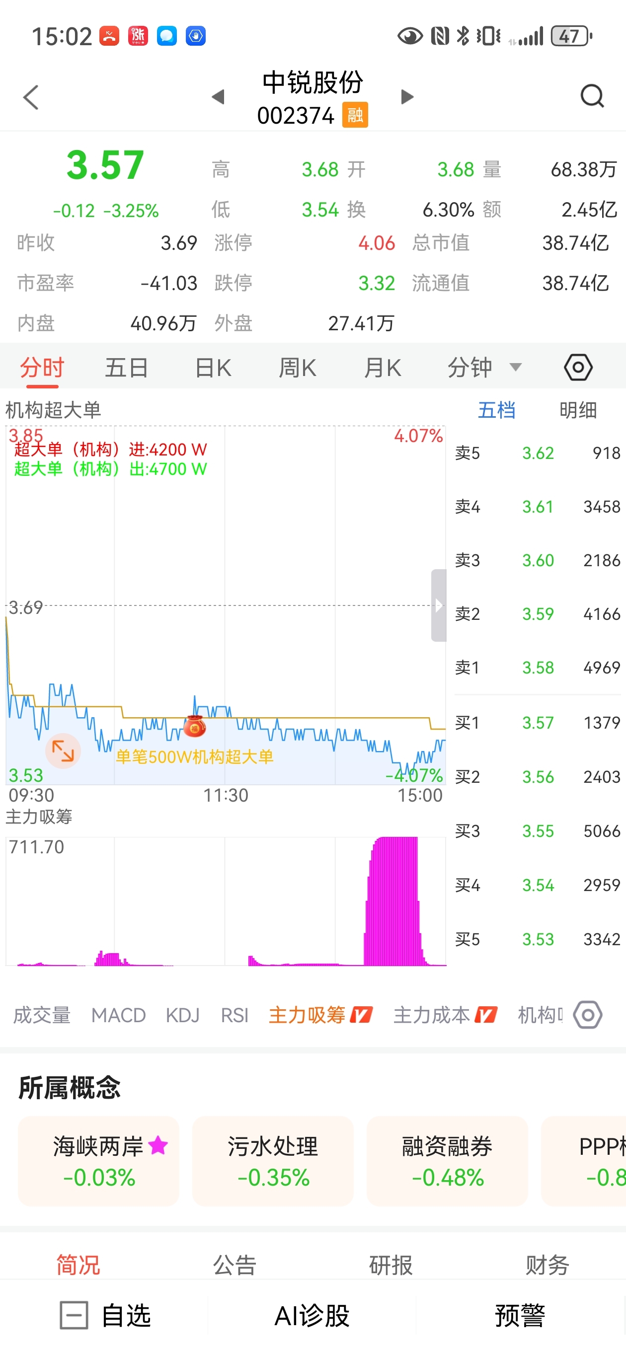 $中锐股份(SZ002374)$ 乘着跌破20日线,恐慌盘涌出,主力猛猛吸货!尾盘3.54元主力顶格吸筹!今天主力开心了,拿到了不少筹码!