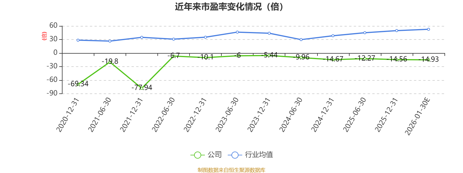 中证智能财讯中锐股份(002374)1月30日晚间披露2025年度业绩预告,预计2025年实现营业收入5.6亿元至5.8亿元;归母净利润亏损2.2亿元至2.8亿元,上年同期亏损2.57亿元;扣非净利润亏损2.3亿元至2.9亿元,上年同期亏损2.61亿元;基本每股收益-0.2元/股至-0.26元/股。以最新收盘价计算,市净率(LF)约4.37倍,市销率(TTM)约6.45倍。