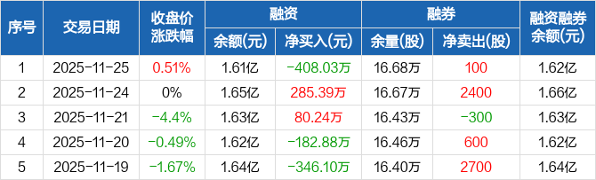 亚厦股份:融资净偿还408.03万元,融资余额1.61亿元(11-25)
