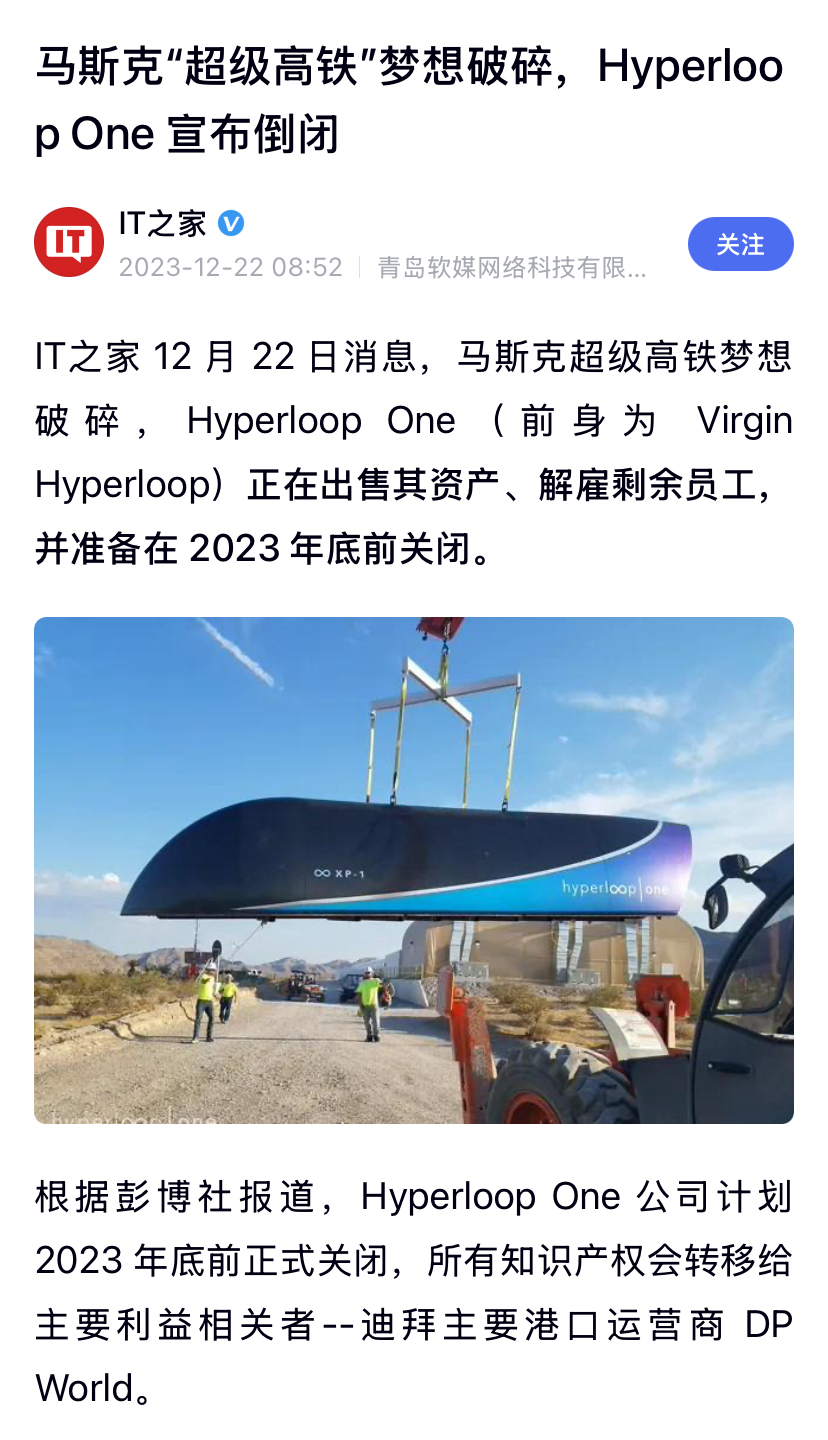 $亚厦股份(SZ002375)$ IT之家 12 月 22 日消息,马斯克超级高铁梦想破碎,Hyperloop One(前身为 Virgin Hyperloop)正在出售其资产、解雇剩余员工,并准备在 2023 年底前关闭。