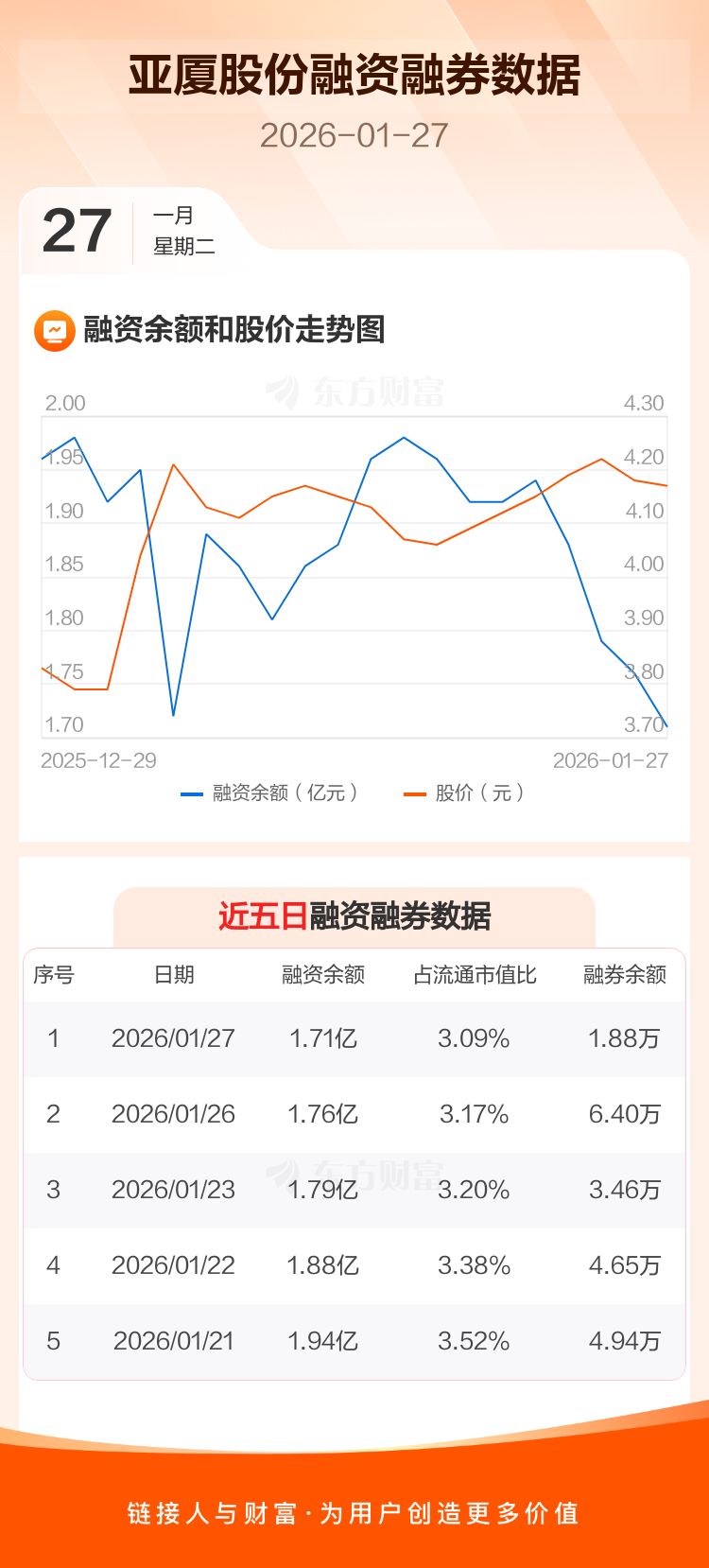 交易所最新数据显示,亚厦股份于2026年1月27日获融资买入777.65万元,融资偿还1298.90万元,当日融资净偿还521.25万元。目前,该股融资余额1.71亿,占流通市值比例为3.09%。