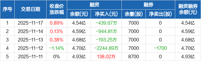 融资方面,当日融资买入991.98万元,融资偿还1431.65万元,融资净偿还439.67万元,连续4日净偿还累计3822.63万元。融券方面,融券卖出0股,融券偿还0股,融券余量7000股,融券余额5.54万元。融资融券余额合计4.54亿元。