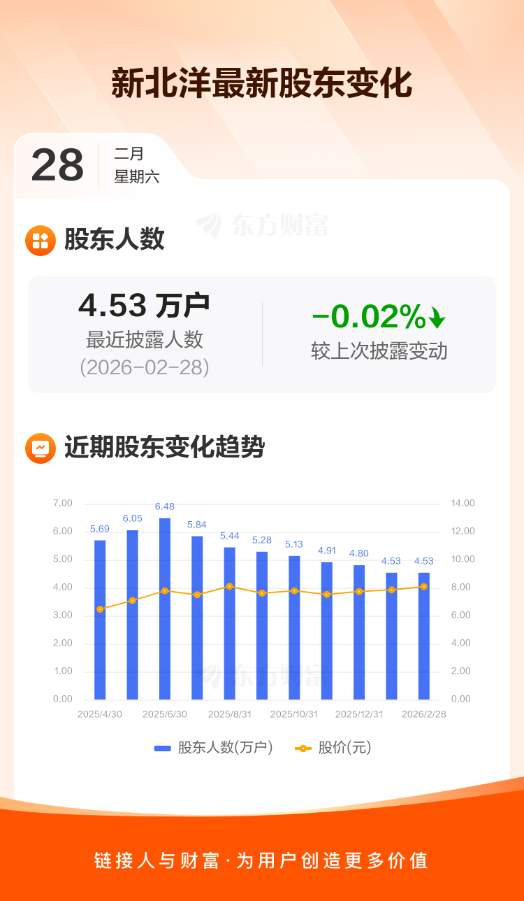 新北洋:截至2月28日最新股东户数4.53万户,较上期减少0.02%