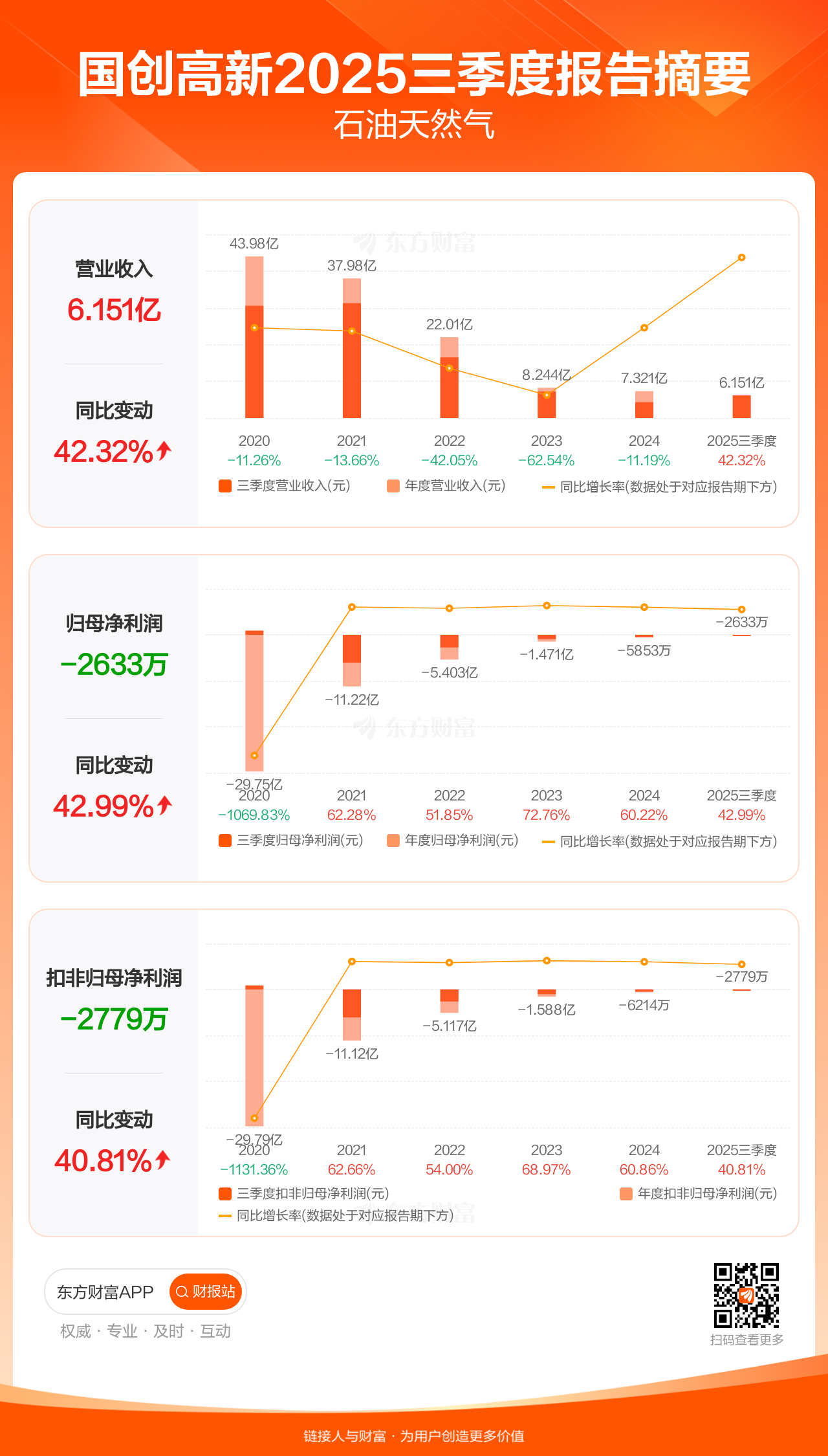 国创高新10月30日发布2025年三季报显示,公司前三季实现营业收入6.15亿元,同比增长42.32%;归母净利润-2632.67万元;扣非归母净利润-2779.06万元。