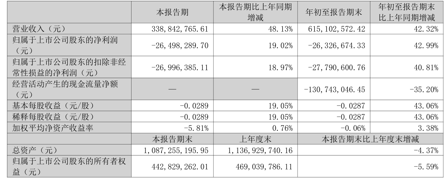 中证智能财讯国创高新(002377)10月30日披露2025年第三季度报告。前三季度公司实现营业总收入6.15亿元,同比增长42.32%;归母净利润亏损2632.67万元,上年同期亏损4617.56万元;扣非净利润亏损2779.06万元,上年同期亏损4695.26万元;经营活动产生的现金流量净额为-1.31亿元,上年同期为-9670.39万元;报告期内,国创高新基本每股收益为-0.0287元,加权平均净资产收益率为-0.06%。