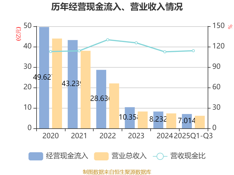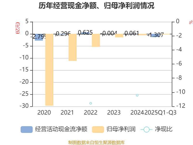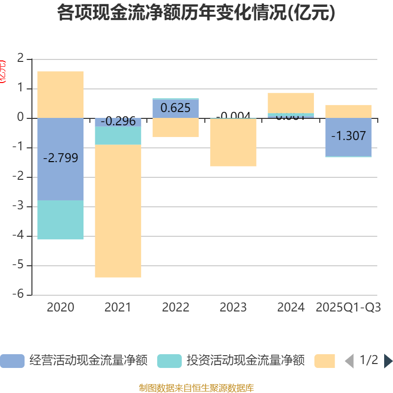 2025年前三季度,公司经营活动现金流净额为-1.31亿元,同比减少3403.91万元;筹资活动现金流净额4352.56万元,同比减少876.86万元;投资活动现金流净额-267.82万元,上年同期为2322.72万元。