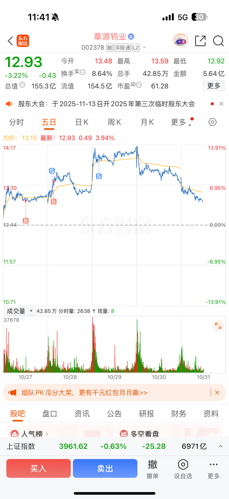 $章源钨业(SZ002378)$ 还好前天卖了 今天看看有没有机会再进来