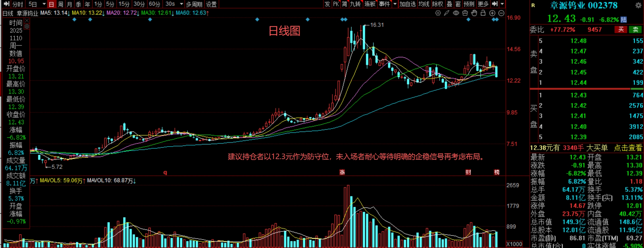 今日股价收于12.43元,放量下跌6.82%,短期走势明显转弱。技术面上看,股价已跌破所有中短期均线,呈现空头排列形态。MACD指标转弱,调整压力显现。操作上建议持仓者以12.3元作为防守位,未入场者耐心等待明确的企稳信号再考虑布局。