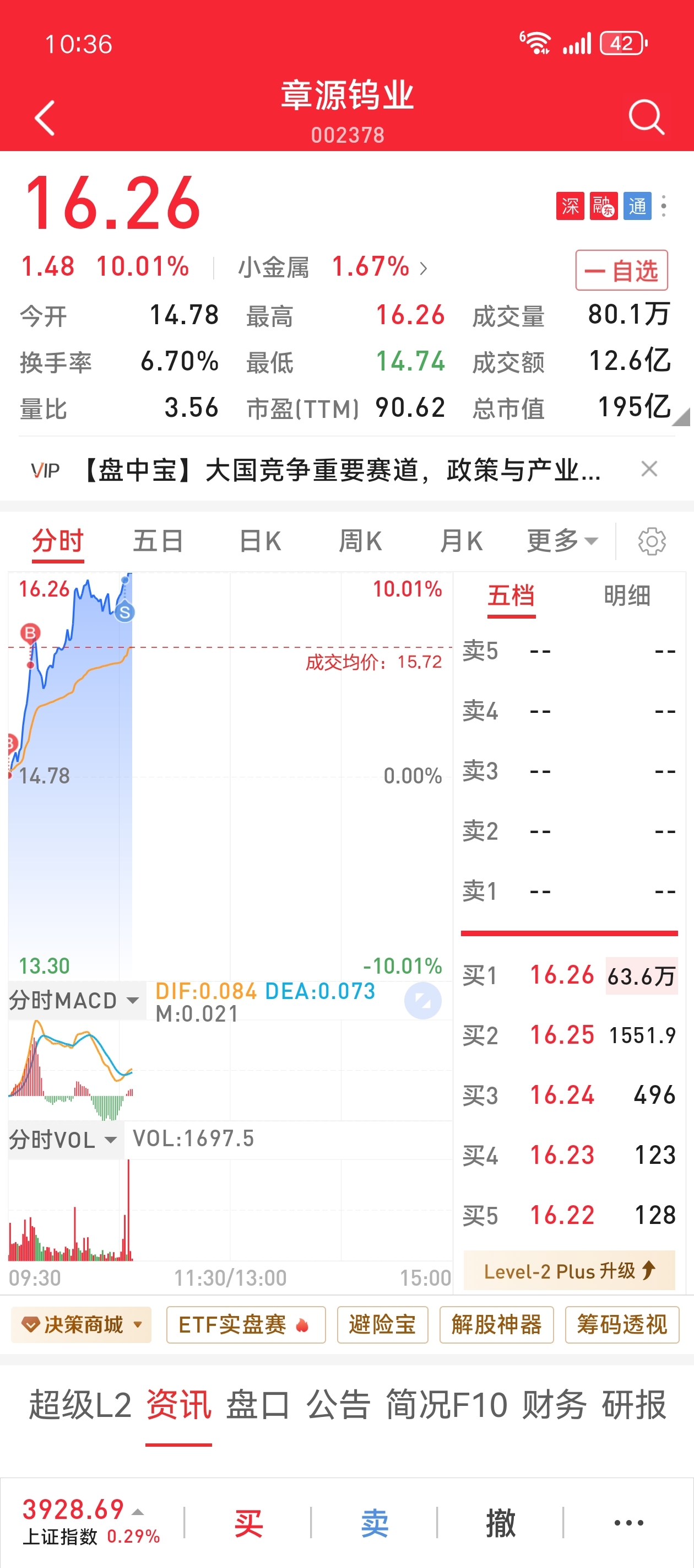 $章源钨业(SZ002378)$ 今天涨停预感强烈,追涨也要买