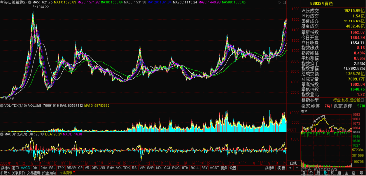 通达信数据显示,当天有色指数承接前几天的强劲升势,盘中大涨2.26%高见1692.04点,为2007年10月19日以来的最高峰。收盘报于1662.87点,涨幅0.49%。板块成交金额1368.76亿元,为1个多月来的最大值。