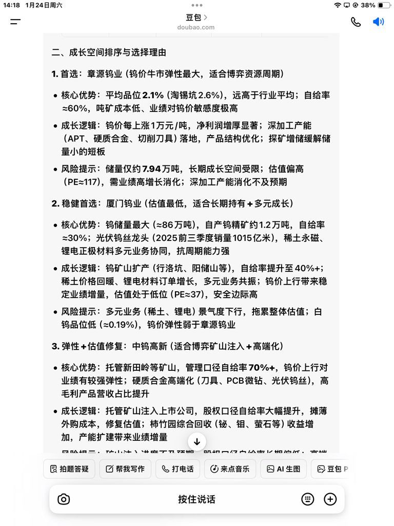 $章源钨业(SZ002378)$ 问豆包:我个人预期金属钨的价格会越来越高。2026 年到 2030 年会连续涨价。在这个背景下,结合现在这三家企业的股票价格,我要买股票的话,这三只股票选哪个,成长空间更大?