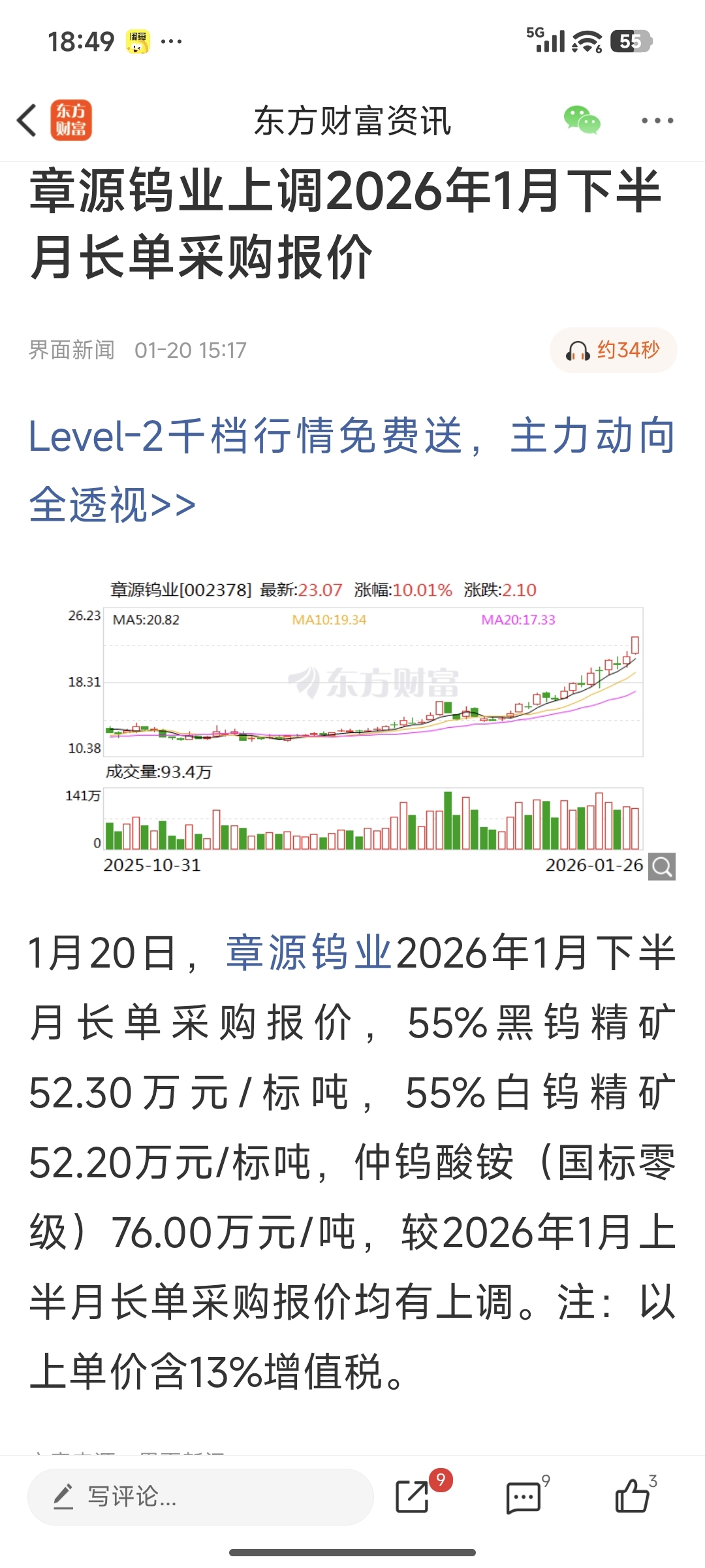 漂亮那边盘前高开20个点。明天希望章源钨业能走的稳健和慢一点,时间长一些。一旦加速后面就是鱼尾行情了。
