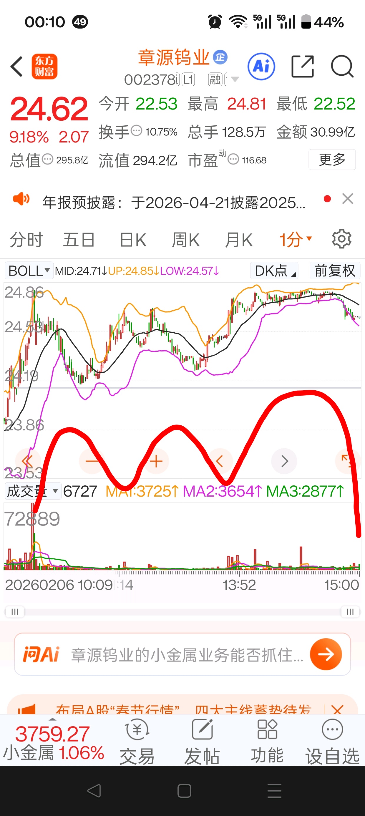 $章源钨业(SZ002378)$ 看,这里说的是盘面图形要下跌。外围好,能延缓一下,推迟下跌时间。 股价涨跌是内因起主要作用的,外围好那是外因。外因也是通过内因起作用的。圆弧顶出来了,下面缺口24.15是买点。