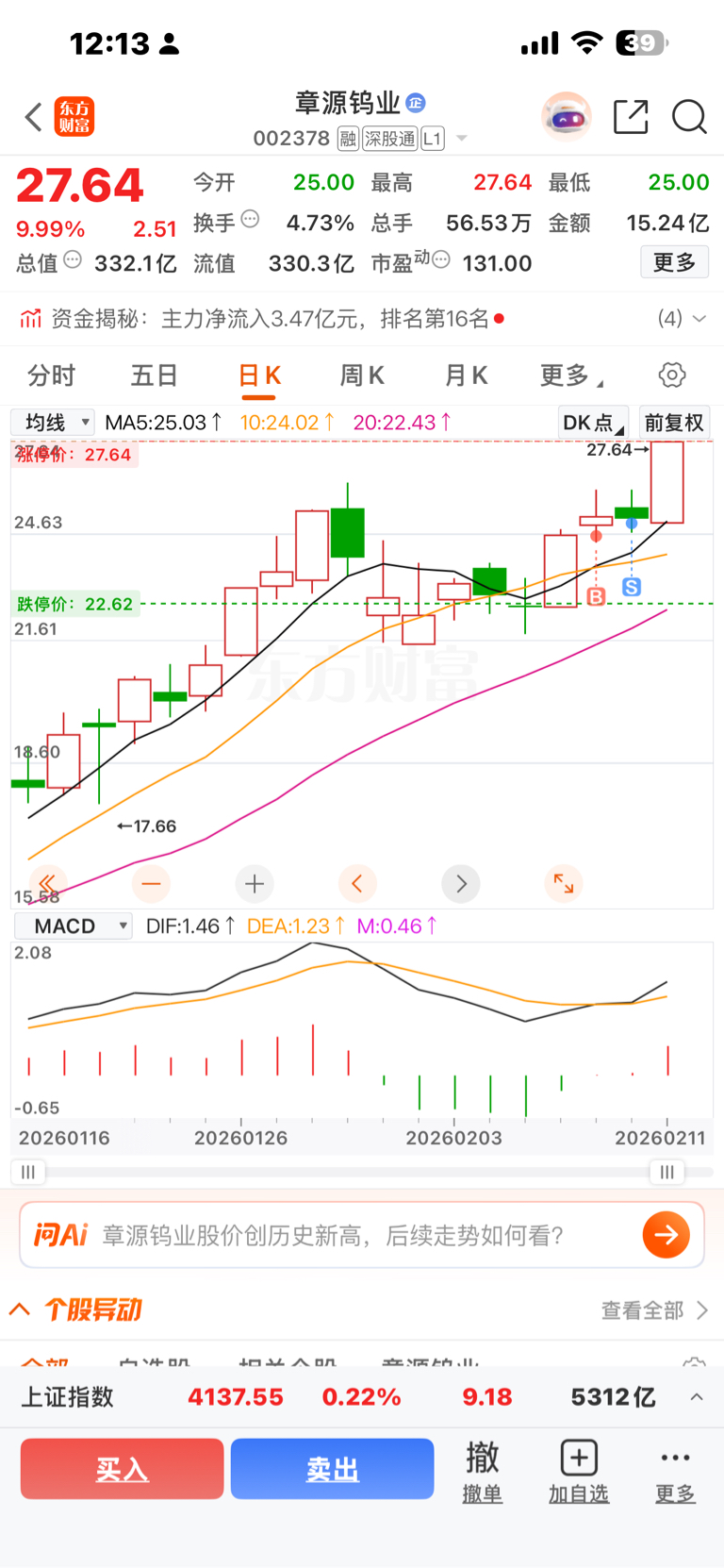 $章源钨业(SZ002378)$ 卖飞了
