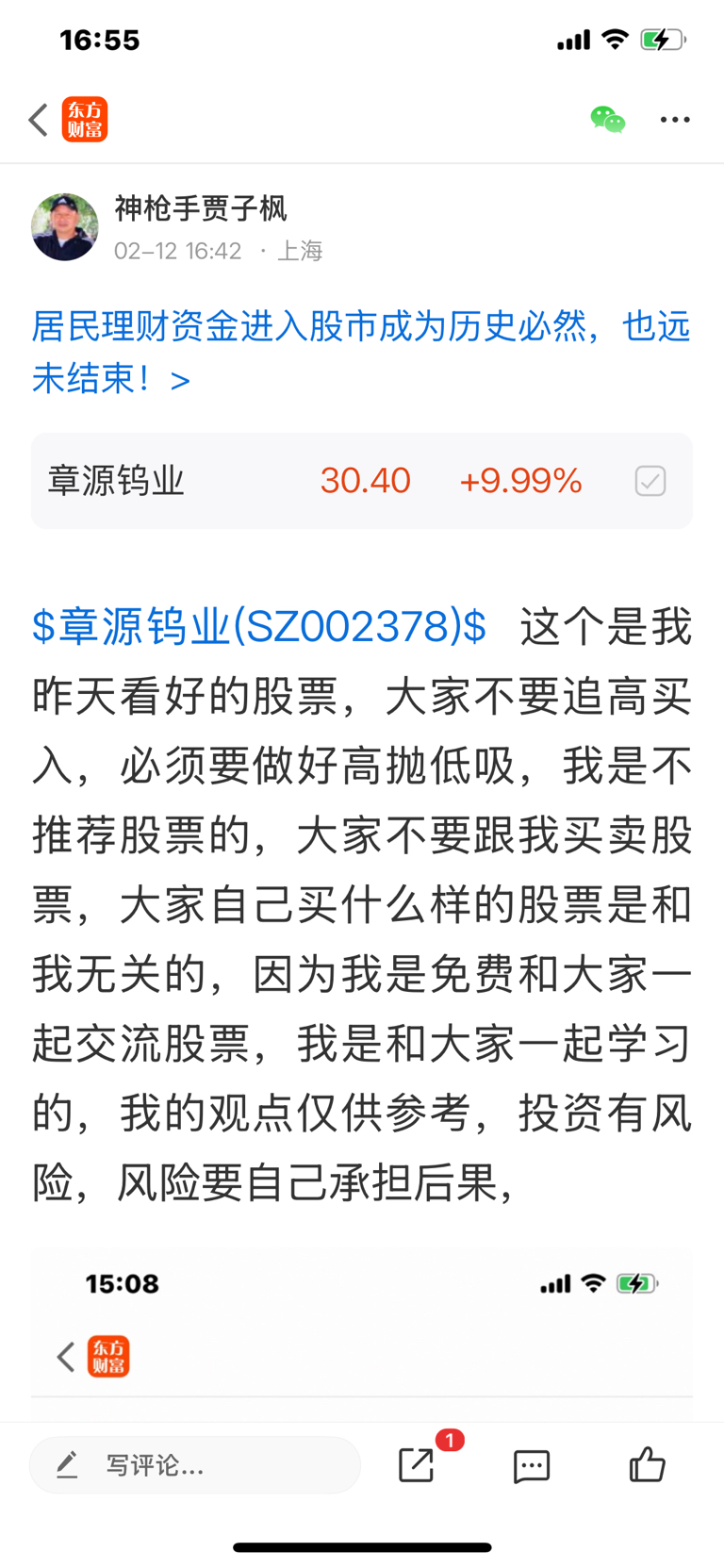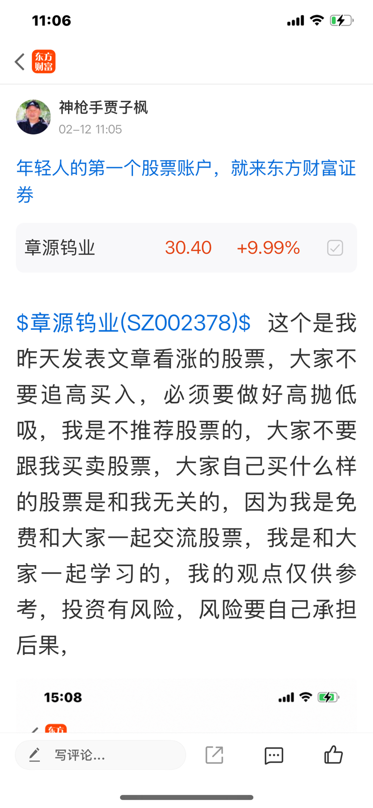 $章源钨业(SZ002378)$ 这个是我二月十一号发表文章看涨的股票,大家不要追高买入,必须要做好高抛低吸,我是不推荐股票的,大家不要跟我买卖股票,大家自己买什么样的股票是和我无关的,因为我是免费和大家一起交流股票,我是和大家一起学习的,我的观点仅供参考,投资有风险,风险要自己承担后果,