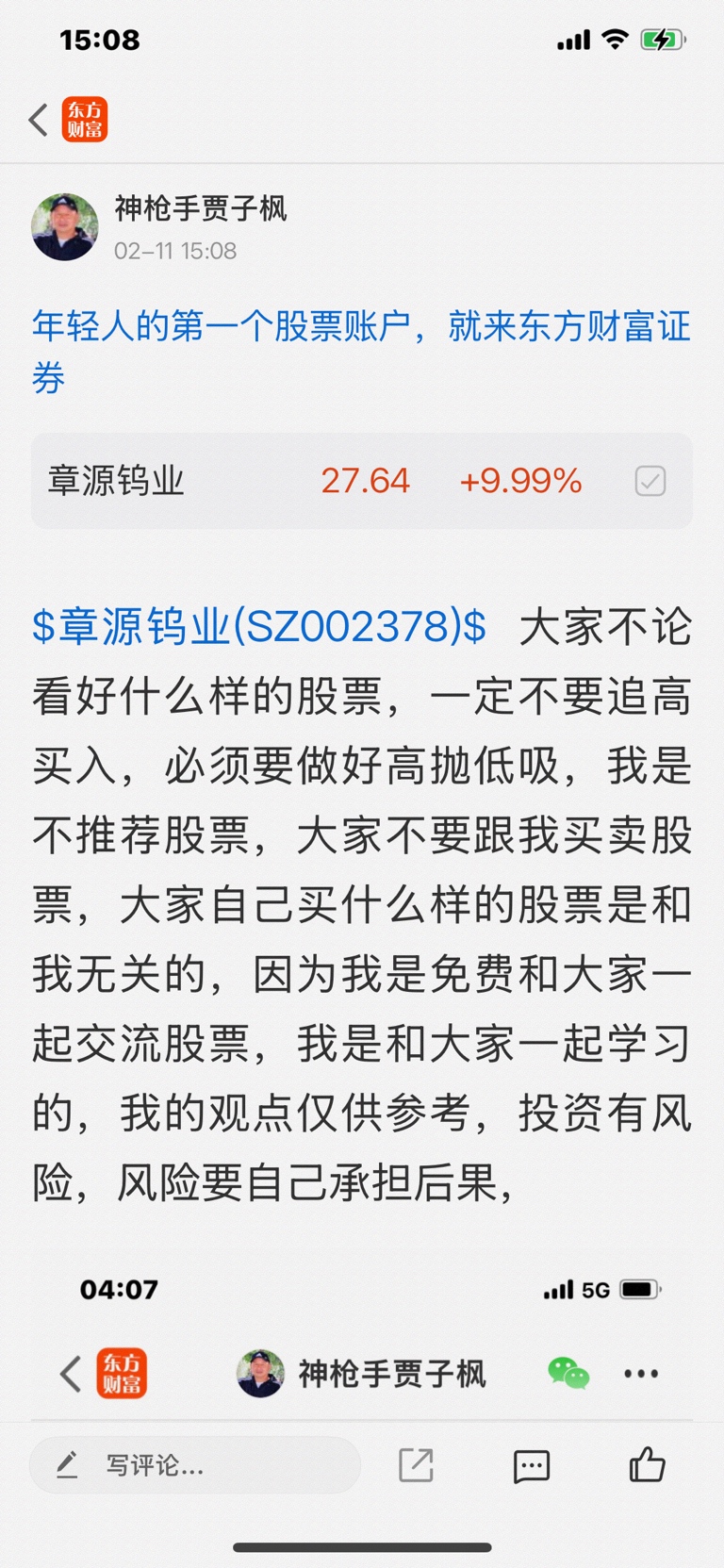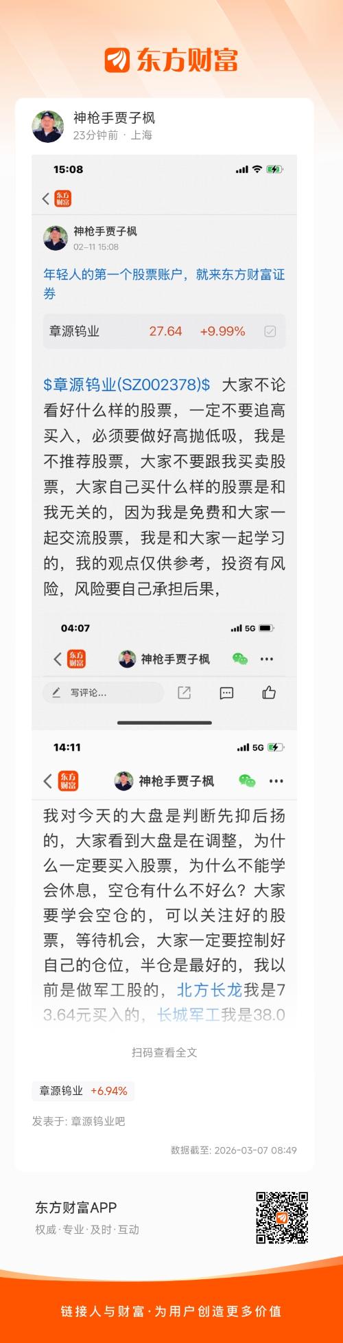 $章源钨业(SZ002378)$ 这个股是我二月十一号开始每天发表文章看涨的股票,这个股是我看好的五大钨王中是排第二大钨王,我是看涨的股票,我是不推荐股票的,大家不要跟我买卖股票,大家自己买什么样的股票是和我无关的,因为我是免费和大家一起交流股票,我是和大家一起学习的,我的观点仅供参考,投资有风险,风险要自己承担后果,