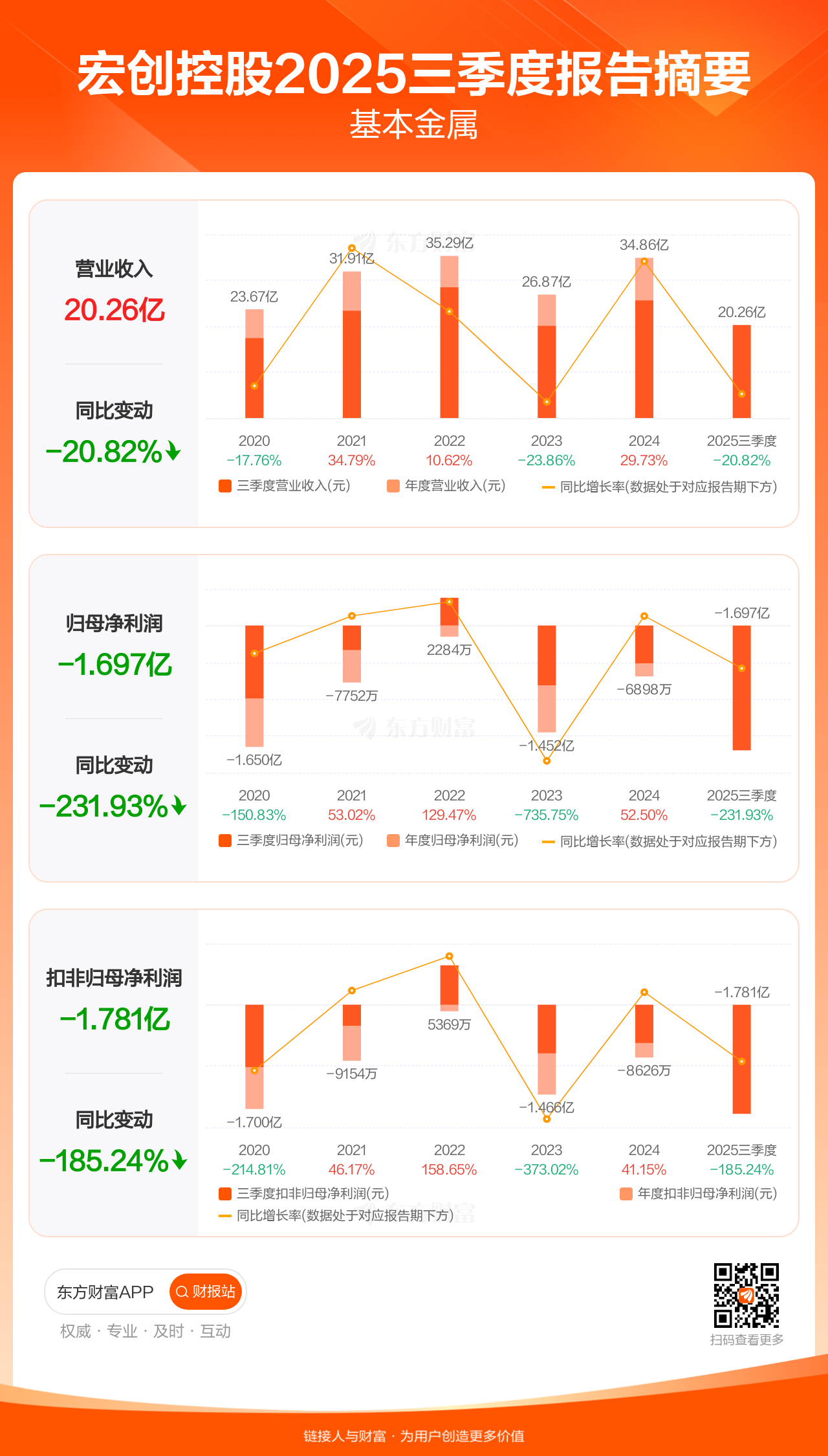 宏创控股10月30日发布2025年三季报显示,公司前三季实现营业收入20.26亿元,同比下滑20.82%;归母净利润-1.70亿元;扣非归母净利润-1.78亿元。