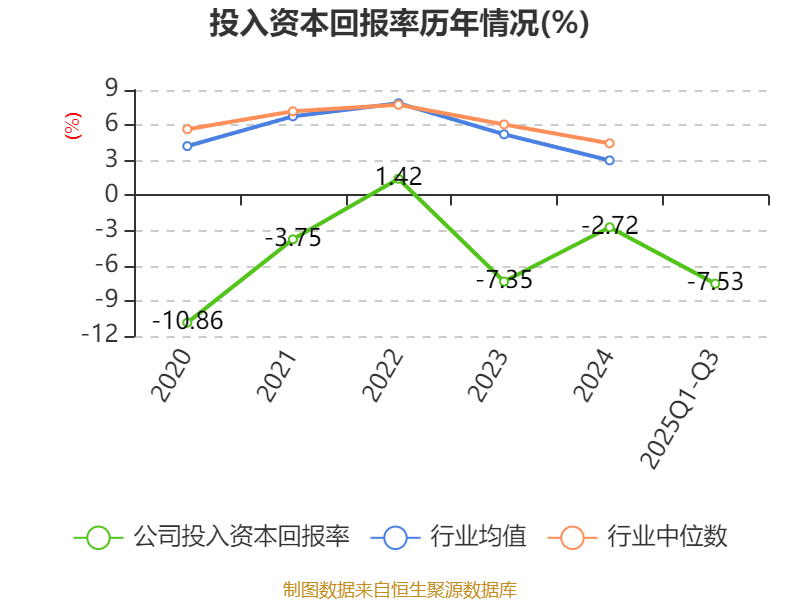 盈利能力方面, 2025年前三季度公司加权平均净资产收益率为-9.05%,同比下降6.5个百分点。公司2025年前三季度投入资本回报率为-7.53%,较上年同期下降5.57个百分点。