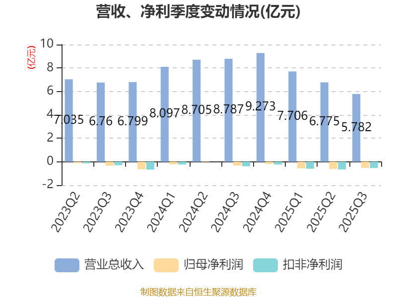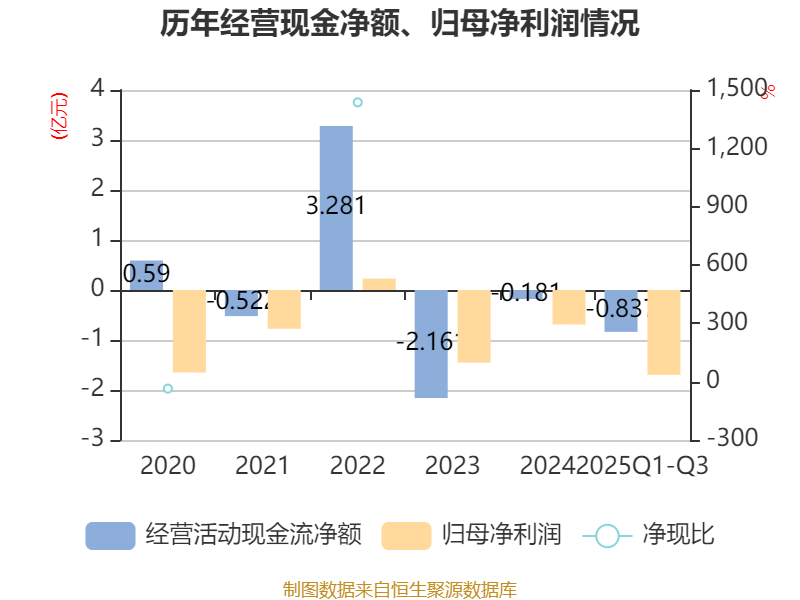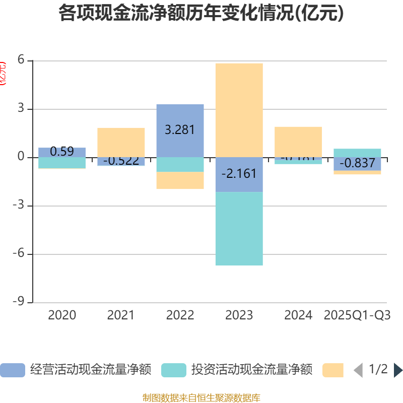 2025年前三季度,公司经营活动现金流净额为-8373.57万元,同比减少1.08亿元;筹资活动现金流净额-2297.59万元,同比减少9993.9万元;投资活动现金流净额5253.2万元,上年同期为653.66万元。
