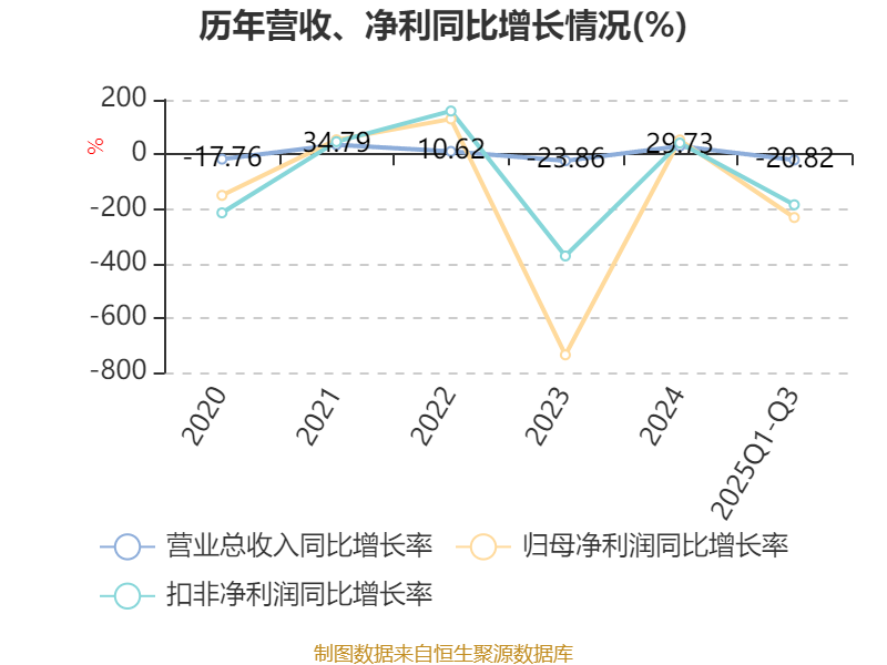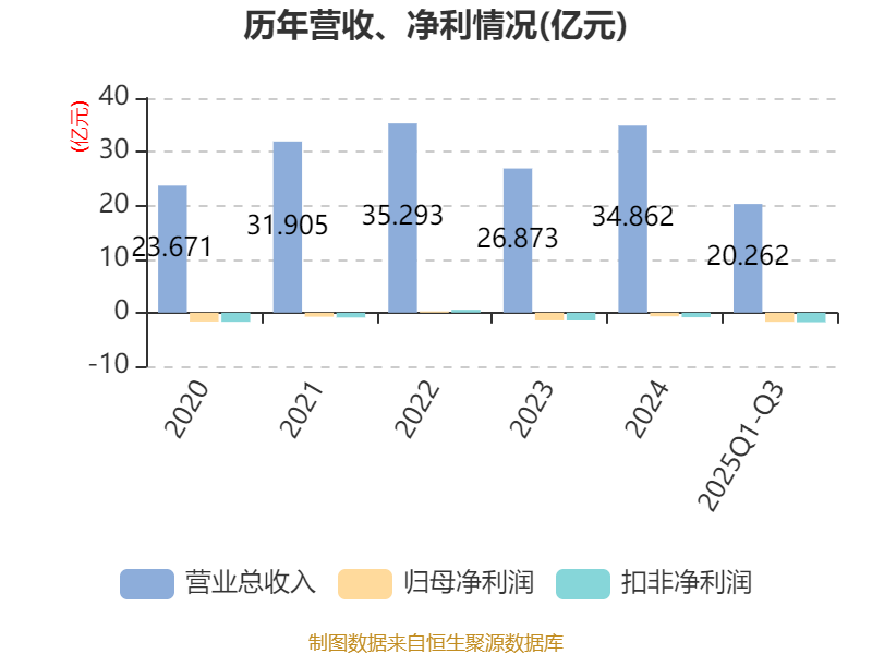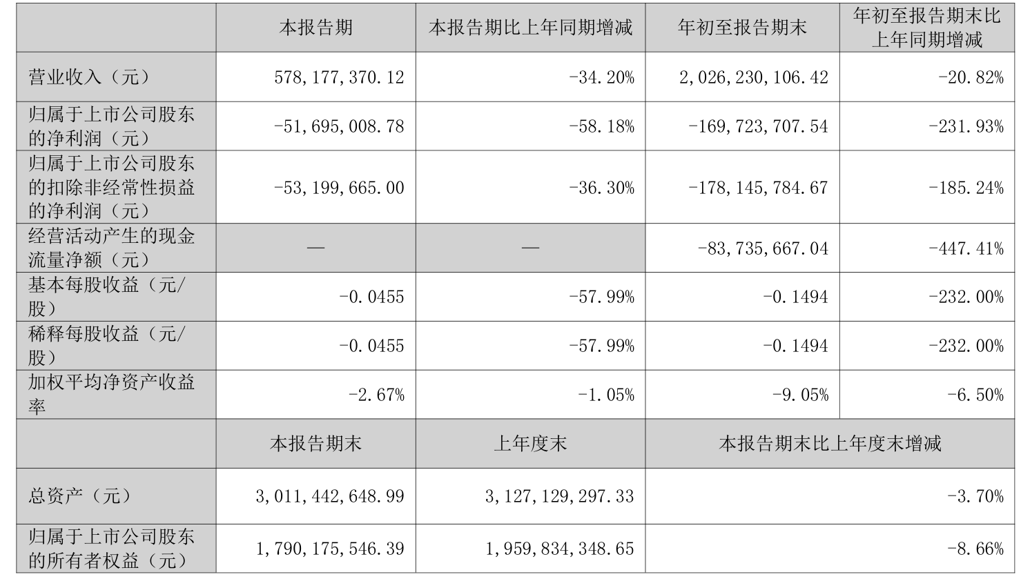 中证智能财讯宏创控股(002379)10月30日披露2025年第三季度报告。前三季度公司实现营业总收入20.26亿元,同比下降20.82%;归母净利润亏损1.7亿元,上年同期亏损5113.3万元;扣非净利润亏损1.78亿元,上年同期亏损6245.54万元;经营活动产生的现金流量净额为-8373.57万元,上年同期为2410.29万元;报告期内,宏创控股基本每股收益为-0.1494元,加权平均净资产收益率为-9.05%。