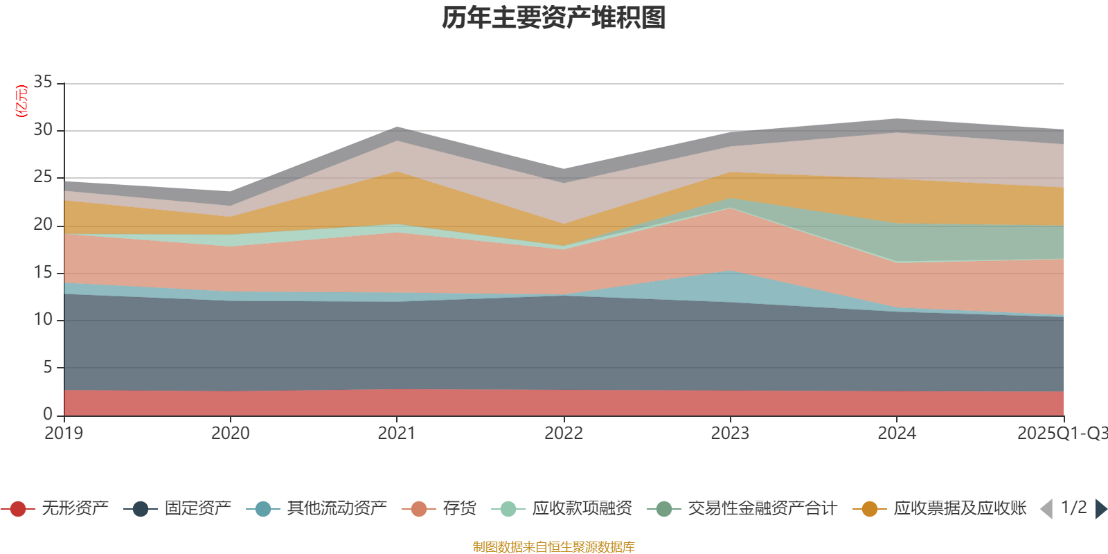 资产重大变化方面,截至2025年三季度末,公司存货较上年末增加25.2%,占公司总资产比重上升4.5个百分点;应收票据及应收账款较上年末减少14.07%,占公司总资产比重下降1.61个百分点;交易性金融资产合计较上年末减少12.81%,占公司总资产比重下降1.22个百分点;其他流动资产较上年末减少52.72%,占公司总资产比重下降0.74个百分点。