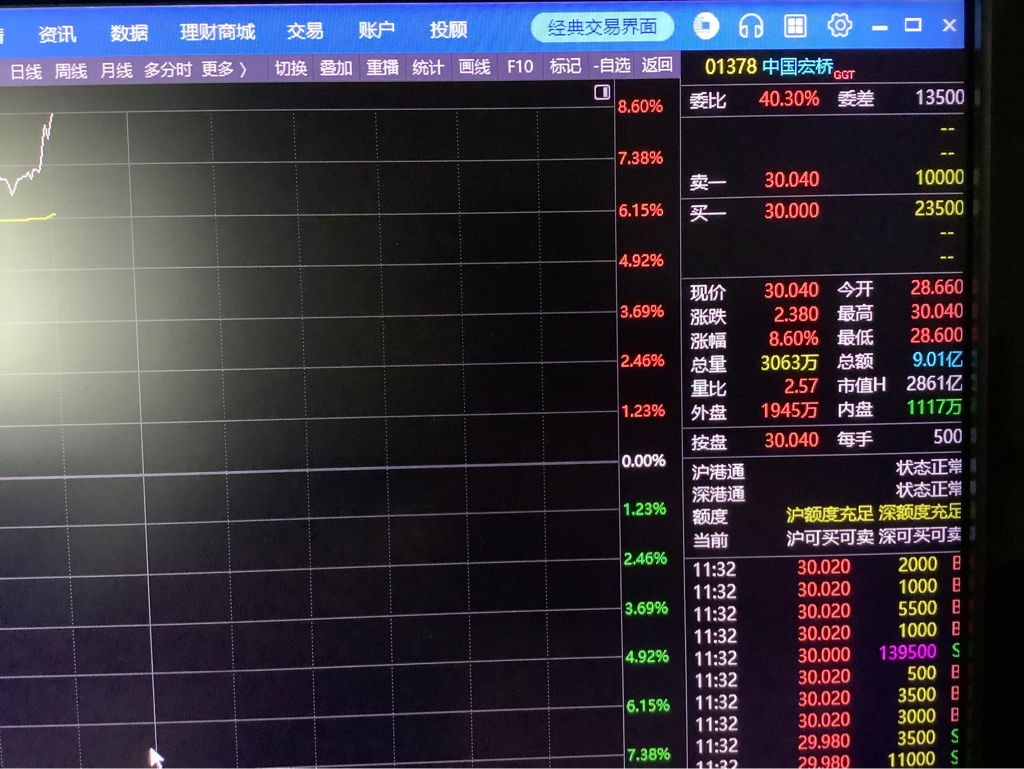 母公司中国宏桥:11.8元已到30.04元了,今天又大涨8.6%了,大单买入1964万股一卖出1126万股=创新高仍大买超838万股(老板)