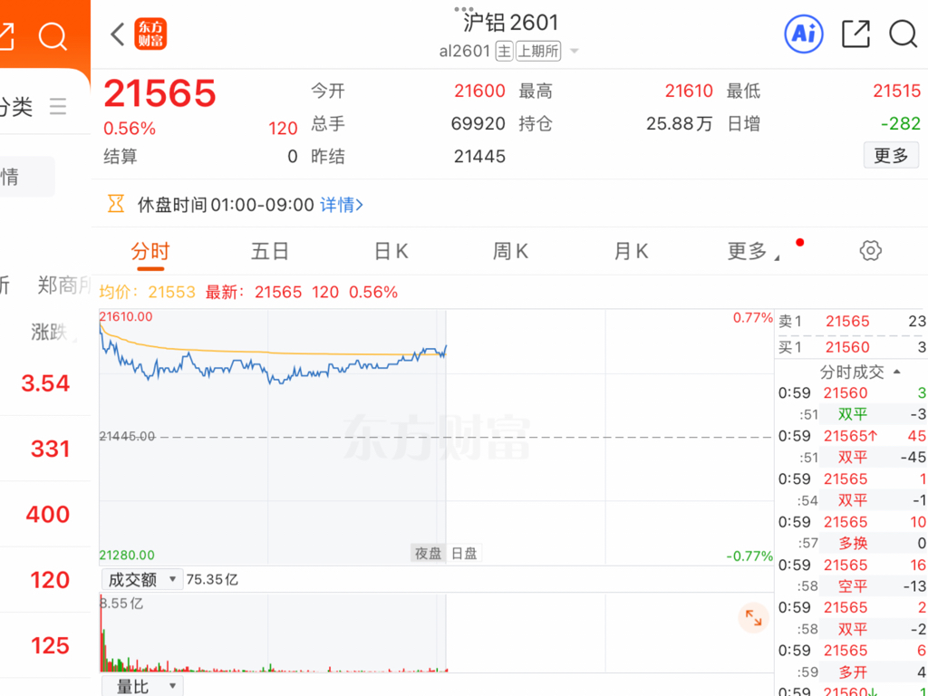 铝价从昨天低点21295快速大涨拉升315元到21610元了