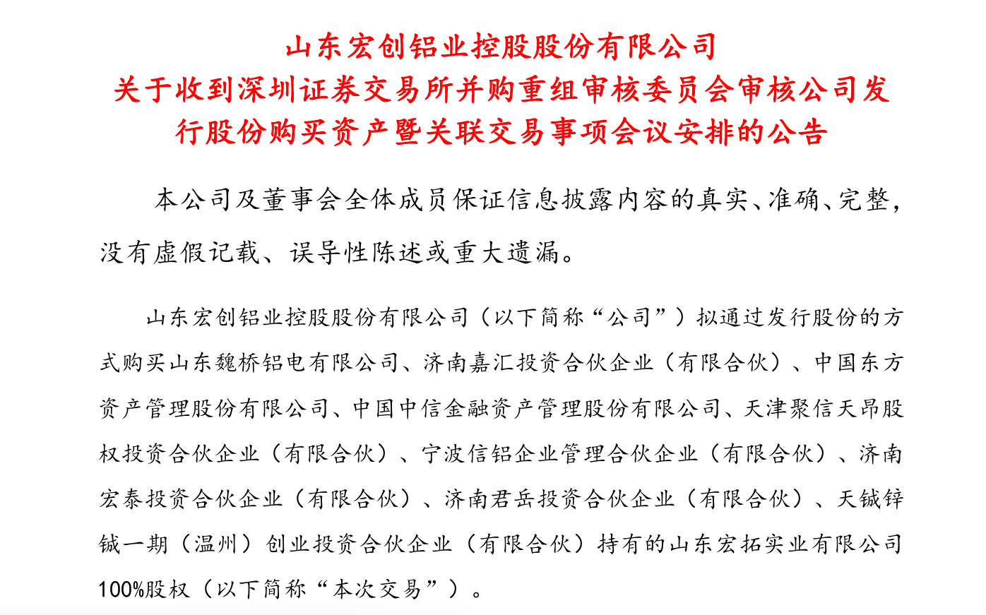 宏创控股披露的交易报告书(草案)(上会稿)显示,该公司拟发行股份购买魏桥铝电、嘉汇投资、东方资管、中信金融资产、聚信天昂、宁波信铝、济南宏泰、君岳投资、天铖锌铖持有的山东宏拓实业有限公司(“宏拓实业”)100%股权,交易作价约为635.18亿元。