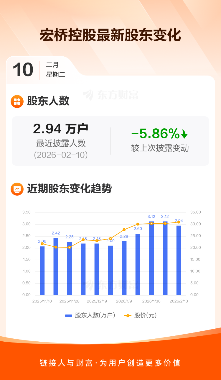 宏桥控股:截至2月10日最新股东户数2.94万户,较上期减少5.86%