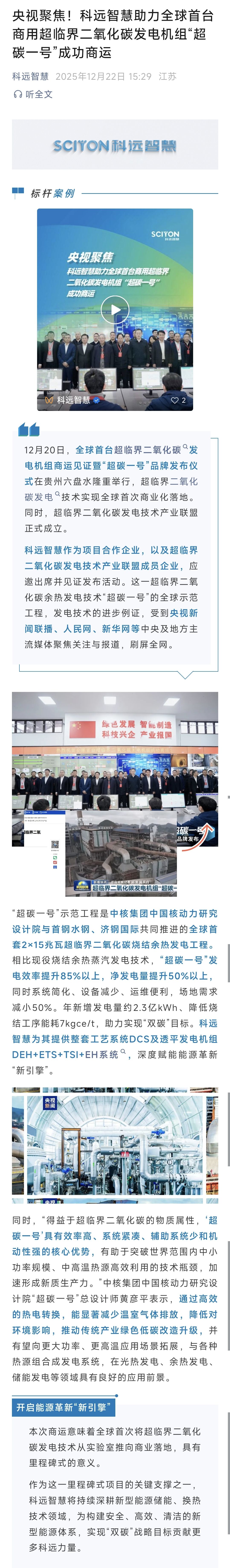 $科远智慧(SZ002380)$ 央视聚焦!科远智慧助力全球首台商用超临界二氧化碳发电机组“超碳一号”成功商运。