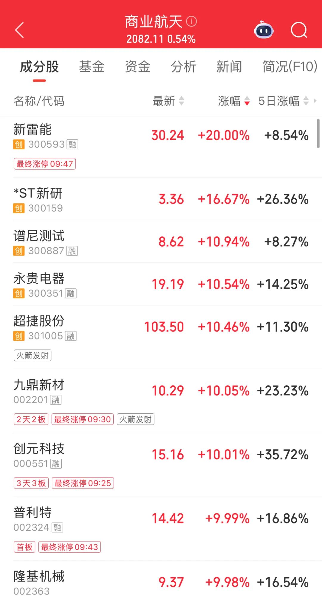 此外,早盘商业航天概念震荡回升,新雷能“20cm”涨停,九鼎新材、普利特、隆基机械等多股涨停,*ST新研、谱尼测试、永贵电器、超捷股份等涨幅居前。
