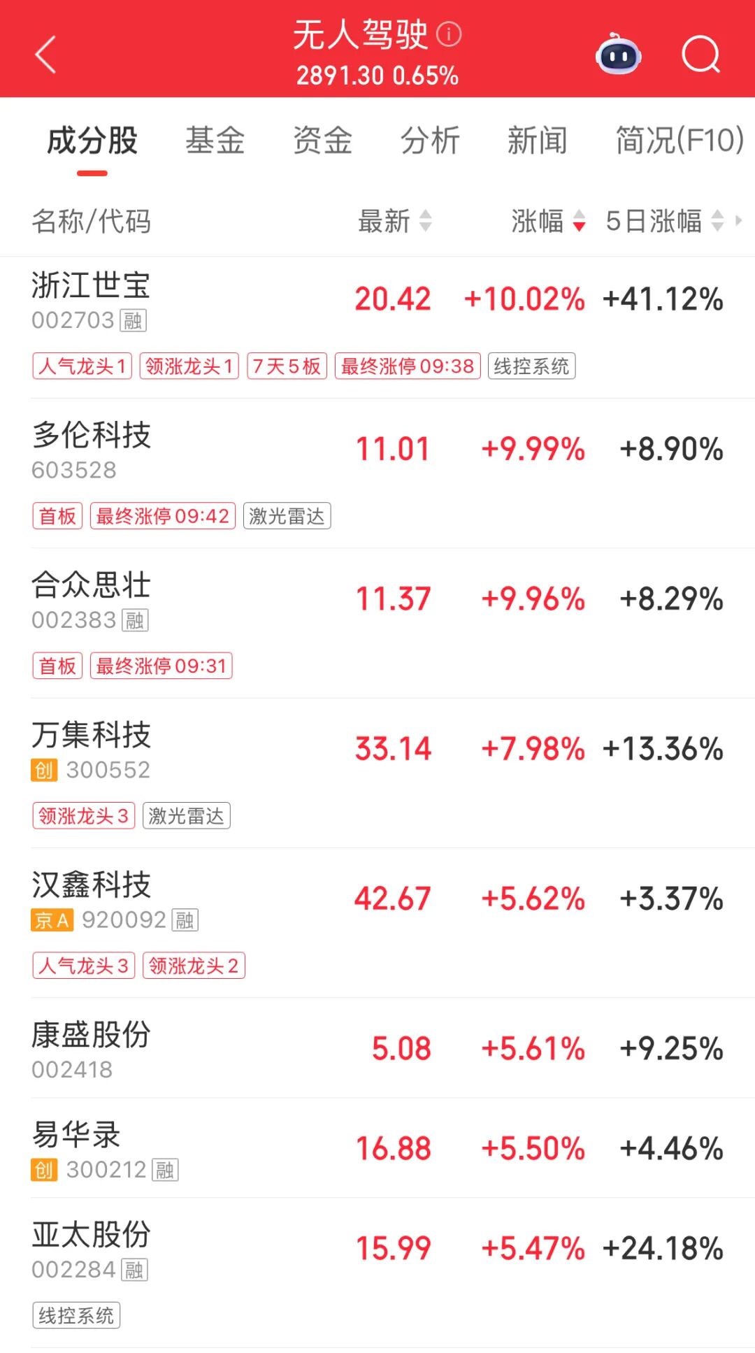 早盘,无人驾驶概念走强,多伦科技涨停,浙江世宝7天5板,合众思壮(002383)开盘仅用一分钟左右直线涨停,万集科技涨近8%,汉鑫科技、康盛股份、易华录等多股跟涨。