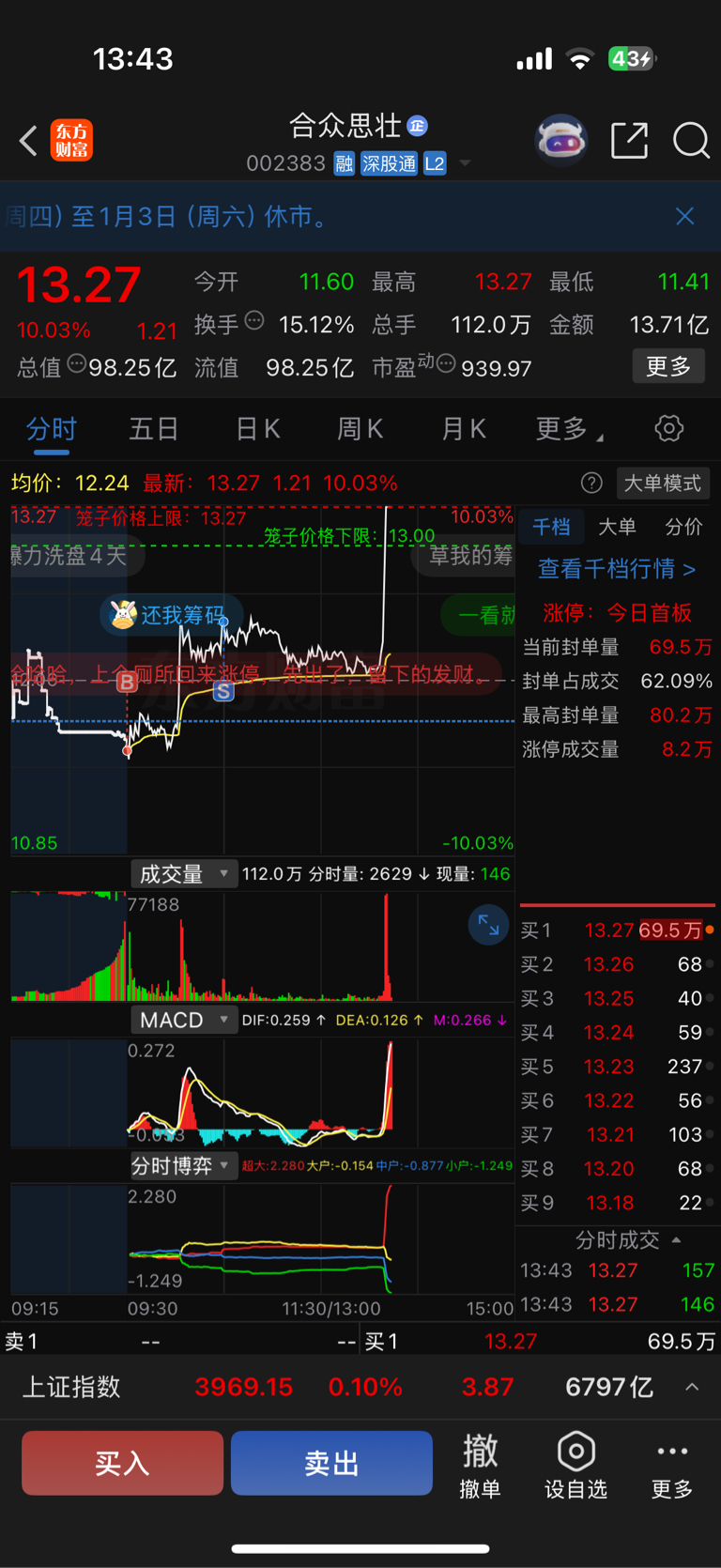 $合众思壮(SZ002383)$ 真没想到能涨停,还想着在T个两三天呢,很棒