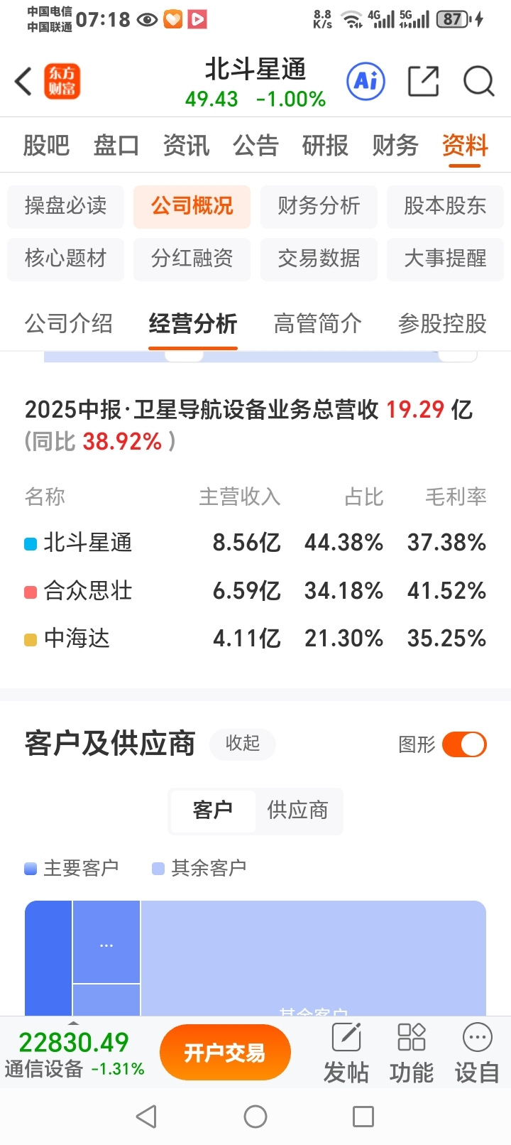 根据公开信息与北斗星通相比,价值严重低估。卫星导航设备等收入近次北斗星通,但该项