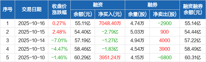 融资方面,当日融资买入2.97亿元,融资偿还2.27亿元,融资净买入7048.4万元。融券方面,融券卖出7900股,融券偿还1.08万股,融券余量4.74万股,融券余额297.1万元。融资融券余额合计55.14亿元。
