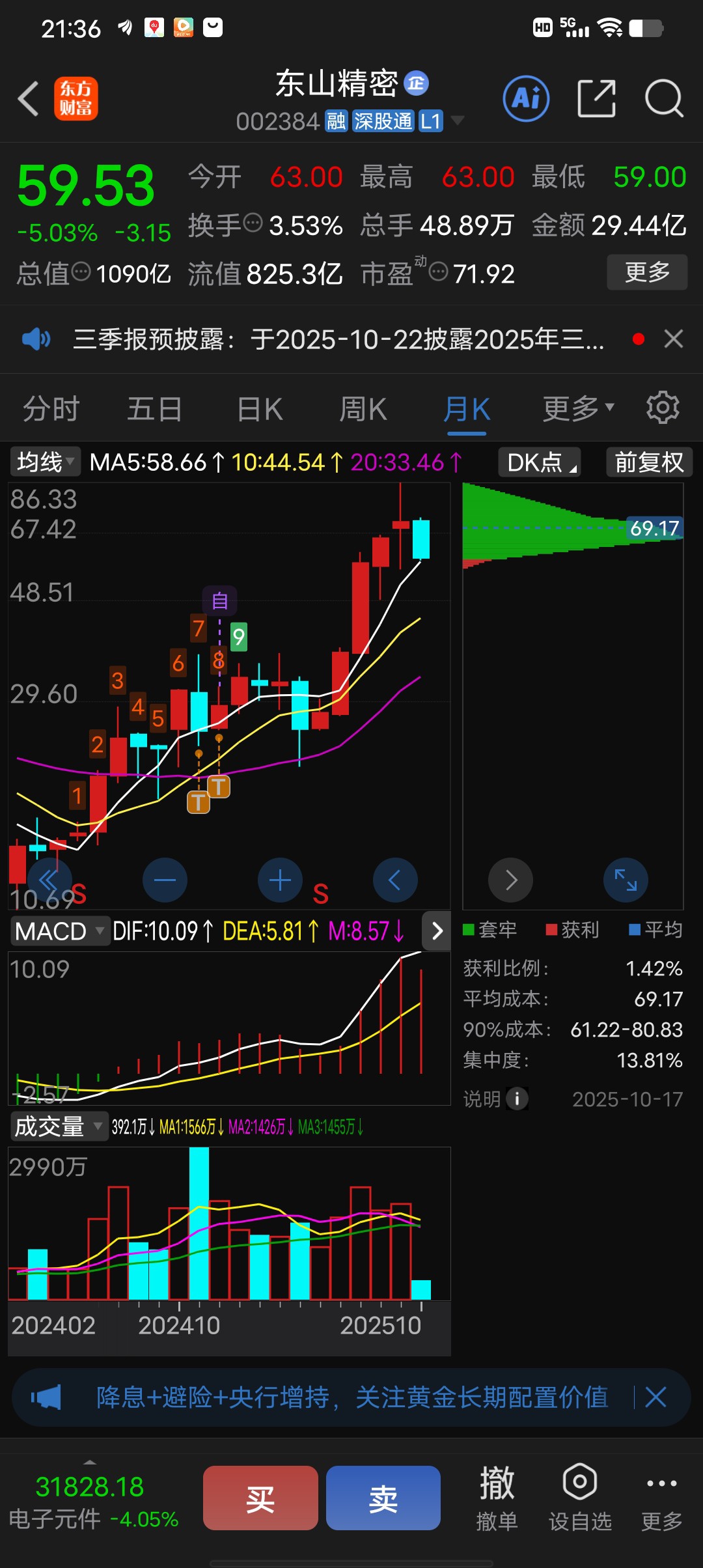 $东山精密(SZ002384)$ 主力的成本只有25元,不要急着补